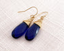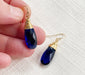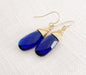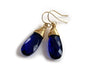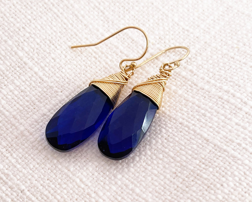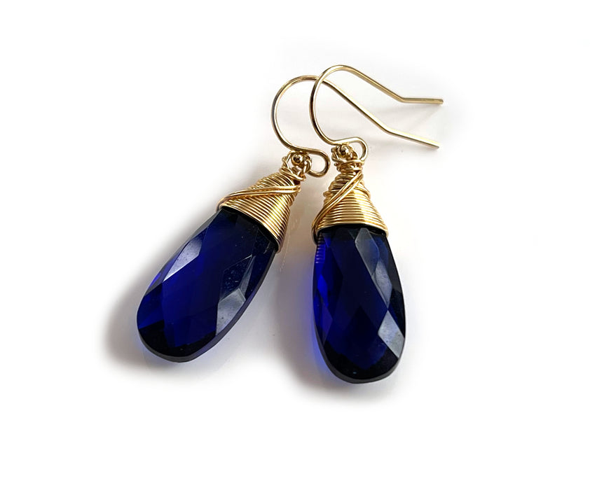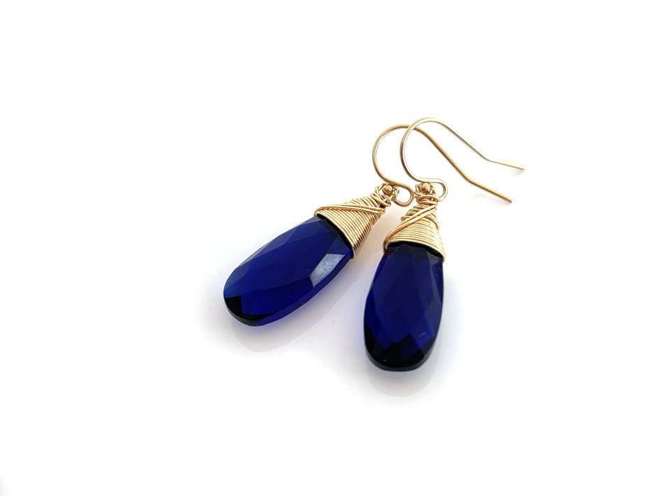 These earrings are handcrafted featuring deep blue hydro quartz gemstones wire wrapped tightly by hand with 14k gold filled wire.Β They measure 1.5 inches from top of 14k gold filled earwires.
