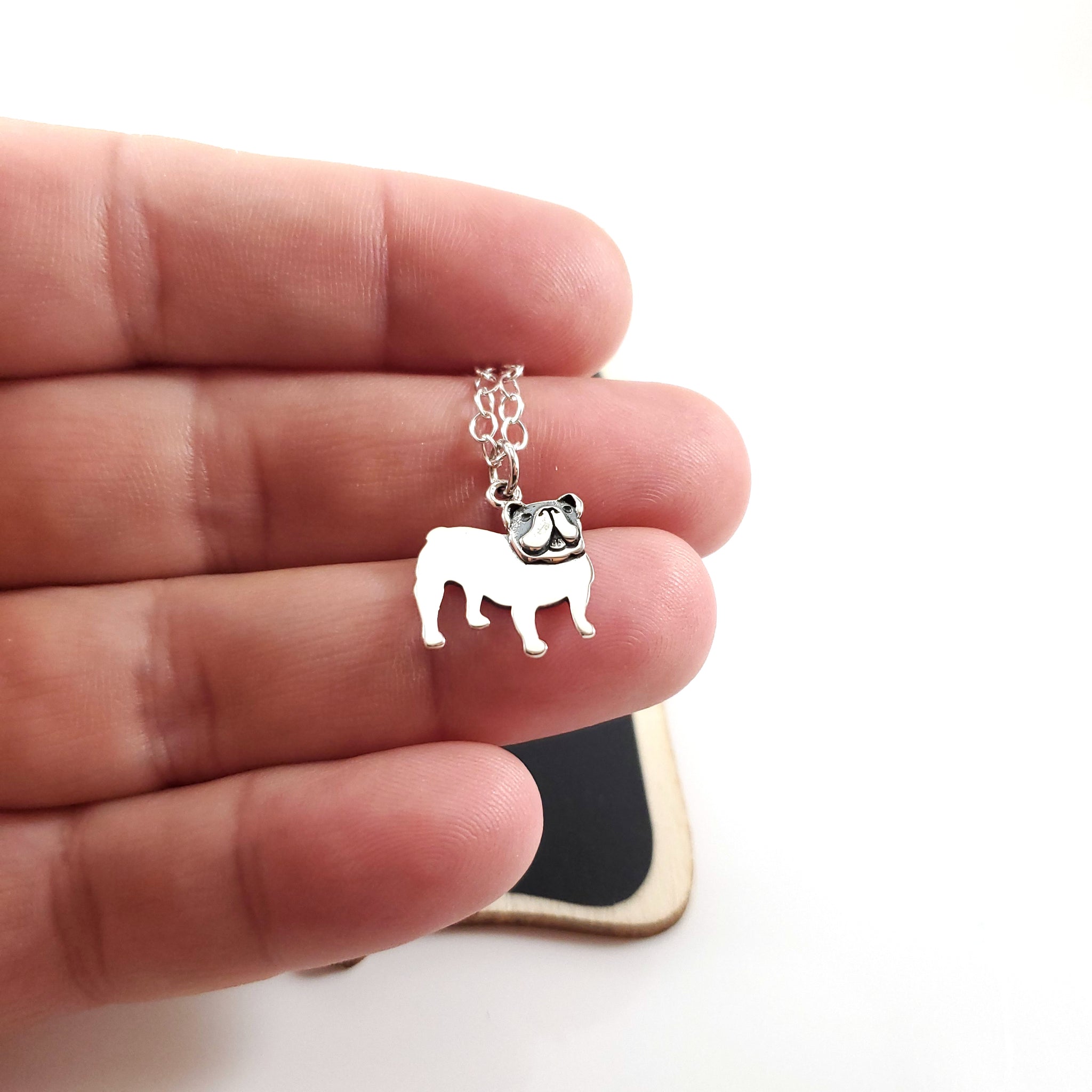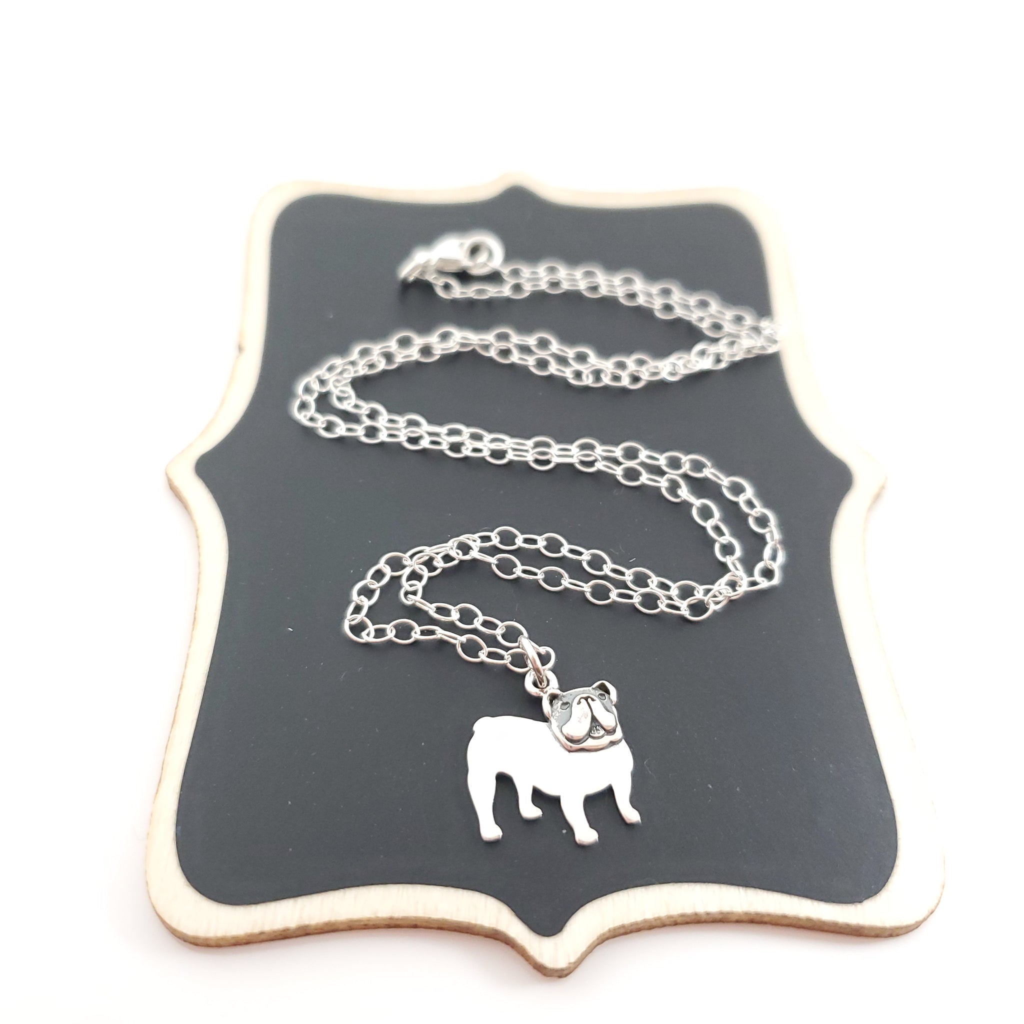 This dainty necklace is handcrafted featuring a detailed Sterling Silver Bulldog Charm attached to a delicate 18 inch, Sterling Silver cable chain with secure lobster claw clasp. Necklace comes on a beautiful insert card, printed on high quality 110lb card stock.