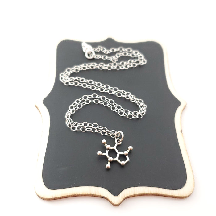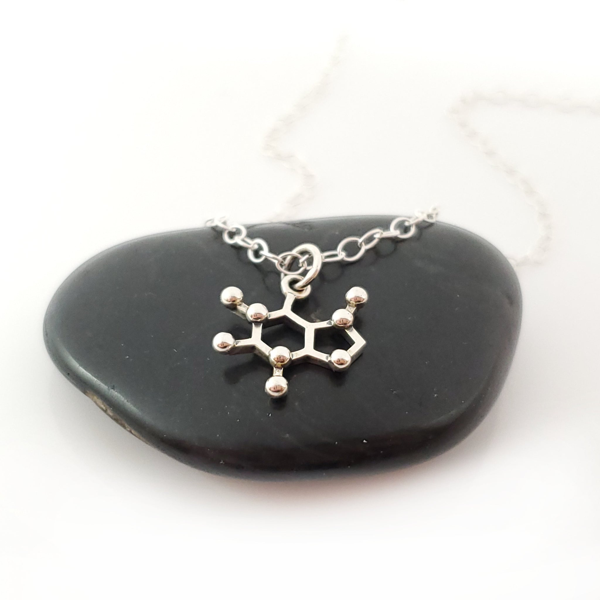 This dainty necklace is handcrafted featuring a detailed Sterling Silver Caffeine Molecule Charm attached to a delicate 18 inch, Sterling Silver cable chain with secure lobster claw clasp. Necklace comes on a beautiful insert card, printed on high quality 110lb card stock.