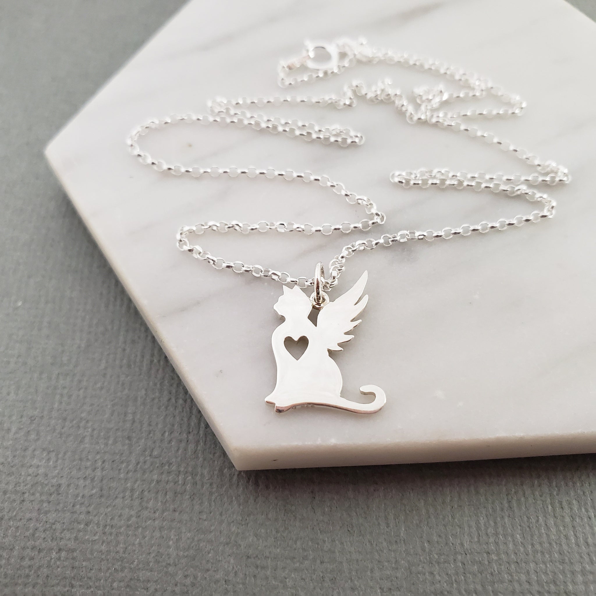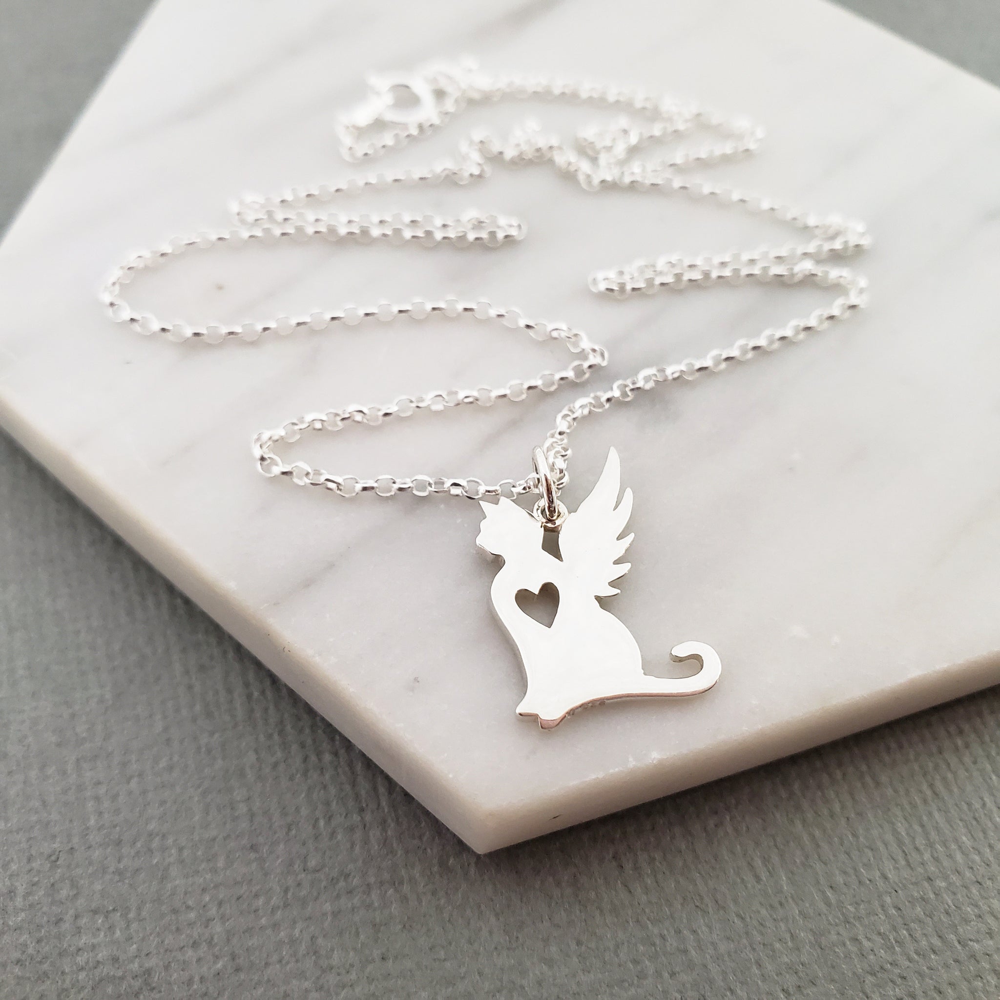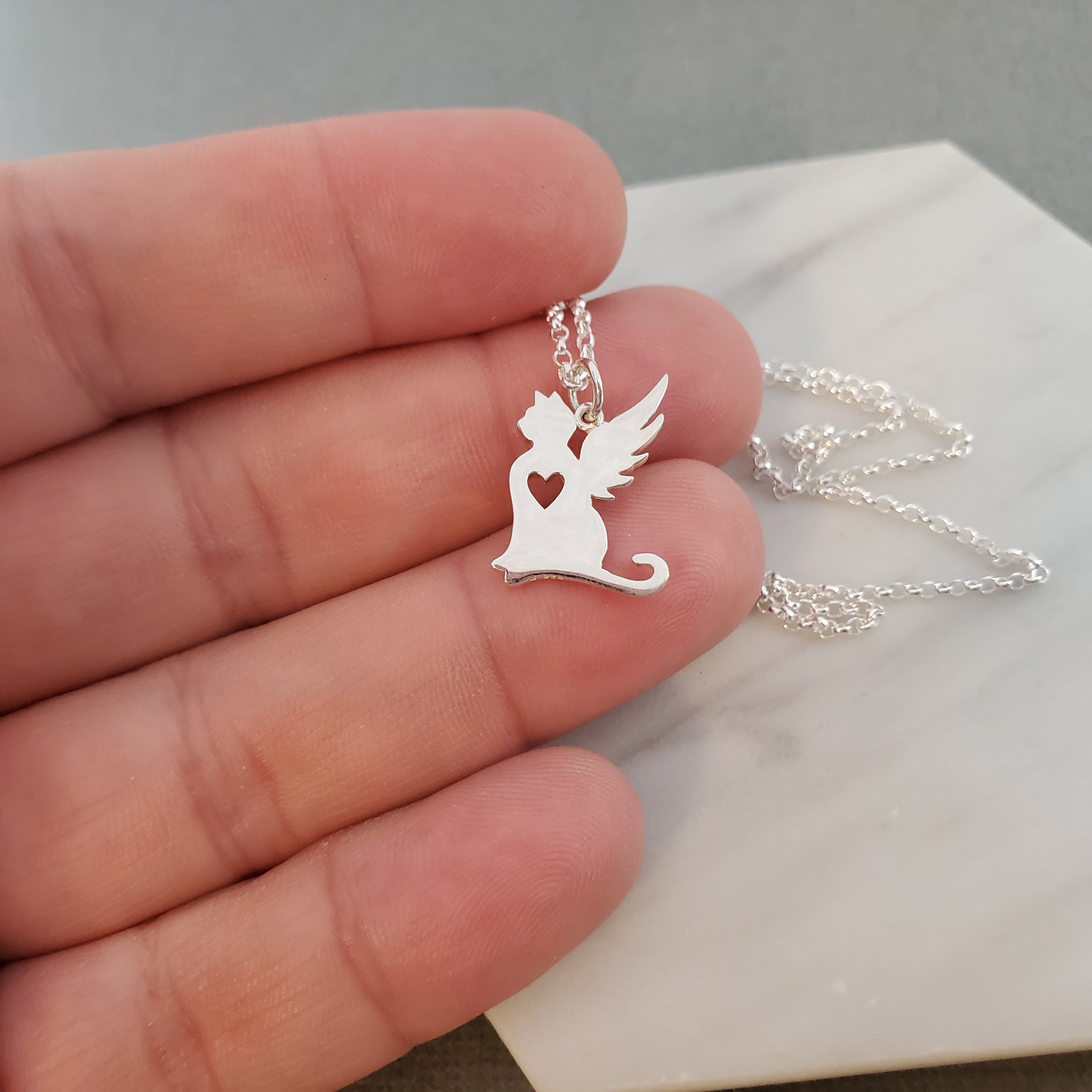 This dainty necklace is handcrafted featuring a detailed Sterling Silver Cat Angel charm attached to a delicate 16 inch, Sterling Silver cable chain with clasp. Necklace comes on a beautiful insert card, printed on high quality 110lb card stock.Β