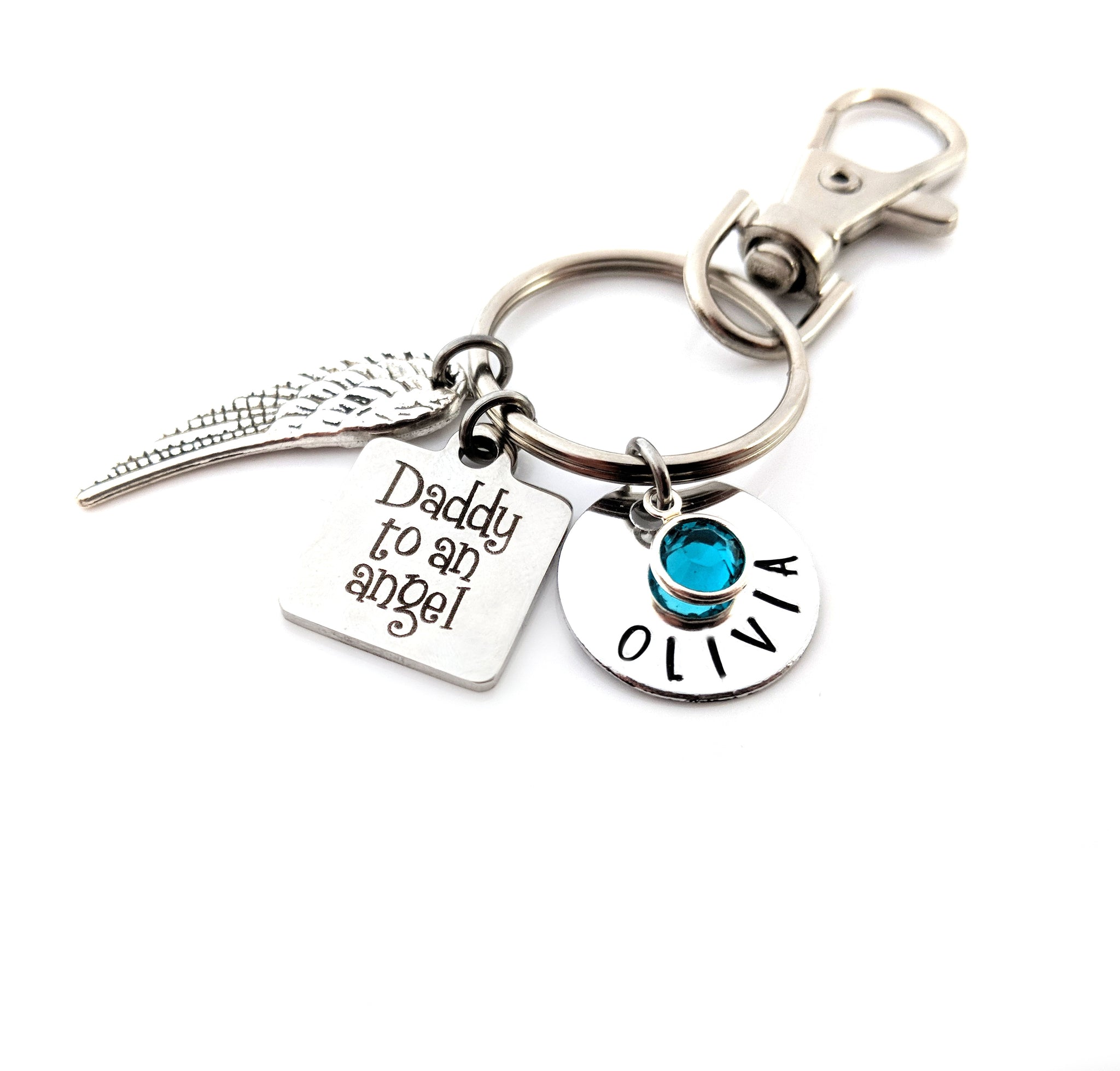 This key chain is handcrafted featuring a Daddy to an angel charm, an angel wing charm and a silver disc hand stamped with name and adorned by a Swarovski crystal birthstone and hand painted with black acrylic paint to enhance the letters. Attached to a stainless steel key ring with swivel lobster clasp.