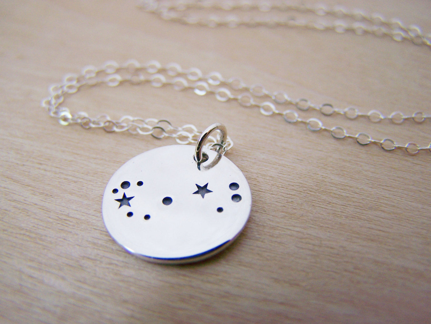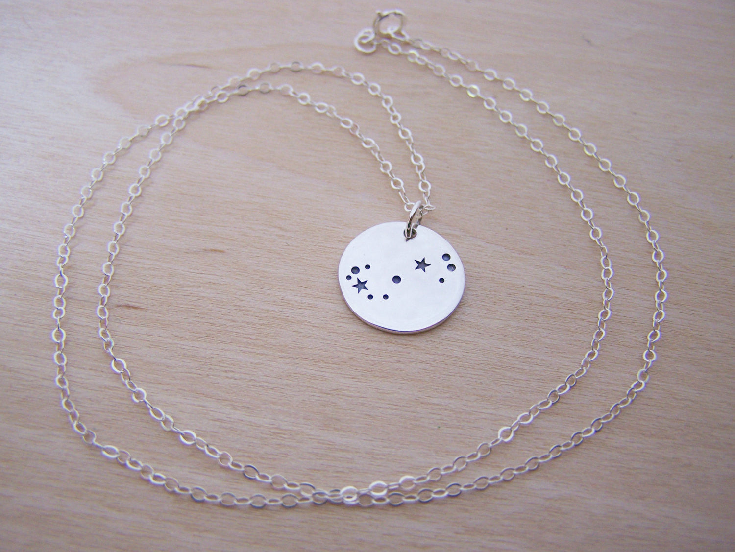 This dainty necklace is handcrafted featuring an adorable Sterling silver zodiac Scorpio constellation charm. Attached to an 18 inch delicate Sterling silver chain with spring ring closure. Zodiac pendant measures 14mm in diameter.