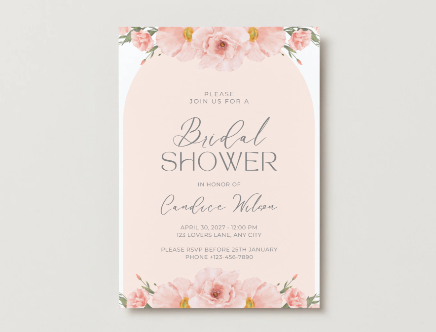 This beautifully designed editable bridal shower invitation features a soft blush floral theme β perfect for a modern, romantic celebration. Easily customize all the text using Canvaβs free platform β no special software needed!