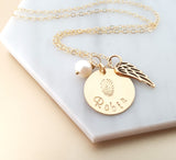 Fingerprint Custom Name Disc Memorial Angel Wing Necklace - 14k Gold Filled Jewelry - Personalized Necklace - Gift For Her