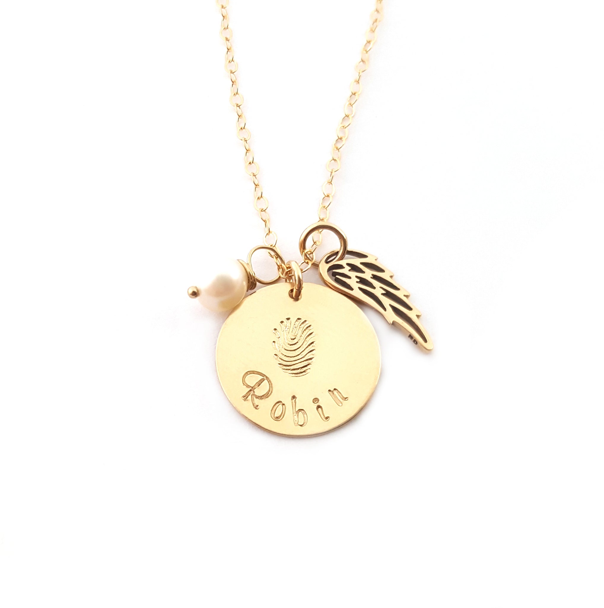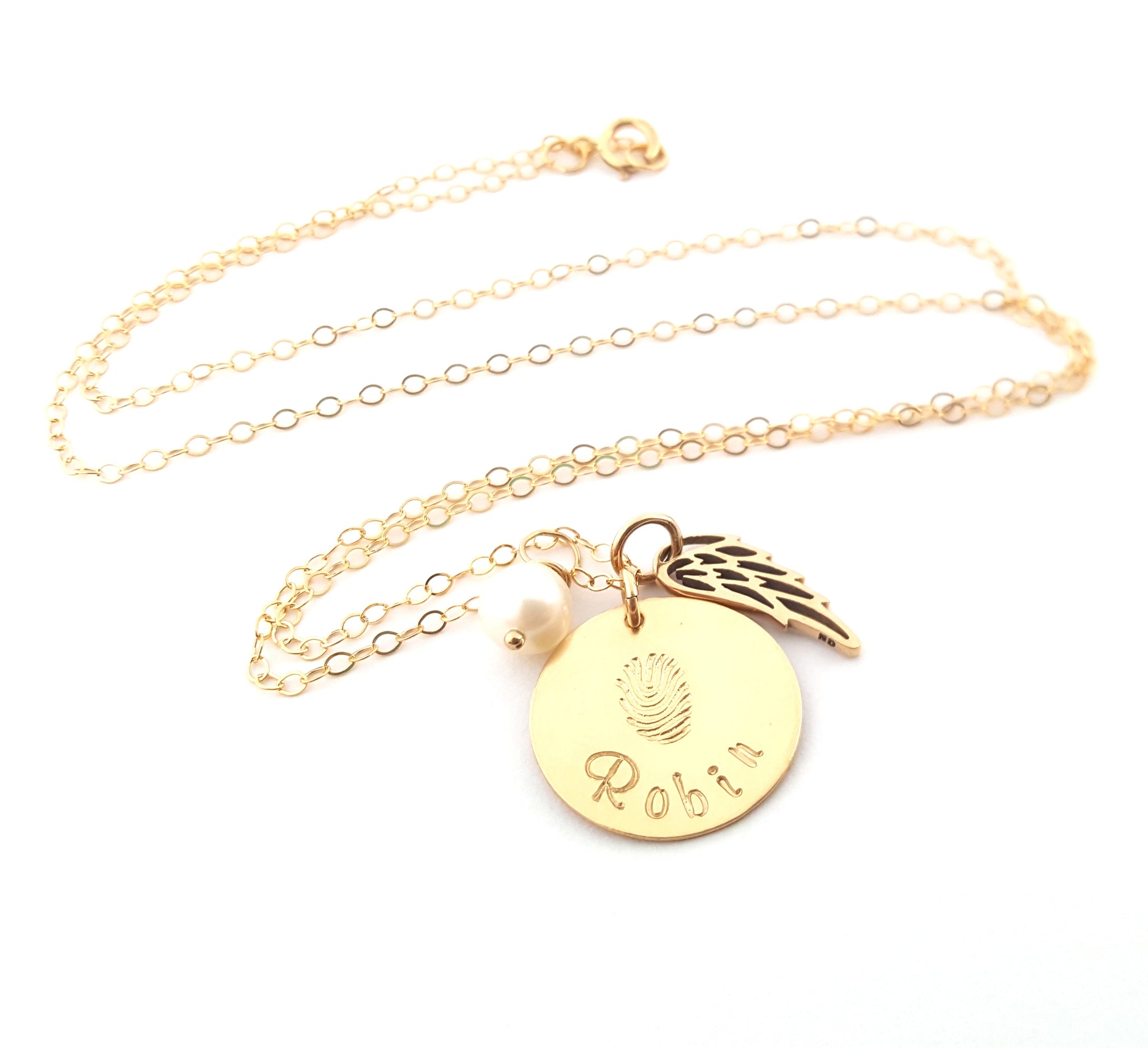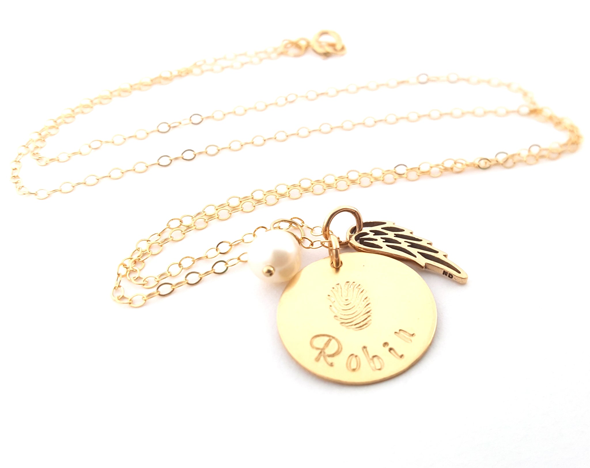 This necklace is handcrafted featuring a beautiful 14k gold filled angel wing charm adorned by a genuine freshwater pearl and a 16mm gold filled disc, hand stamped with your name (up to 9 characters) and a fingerprint symbol. Made to order to your specified length with shiny 14k yellow gold filled chain and secure spring ring clasp.