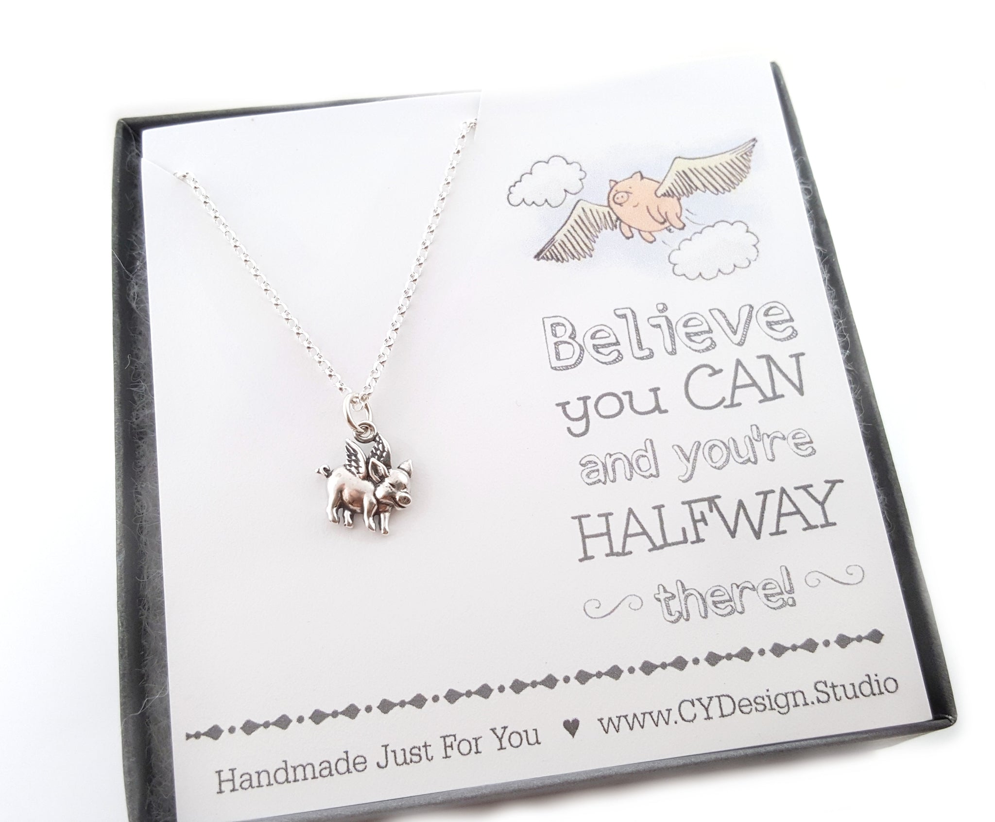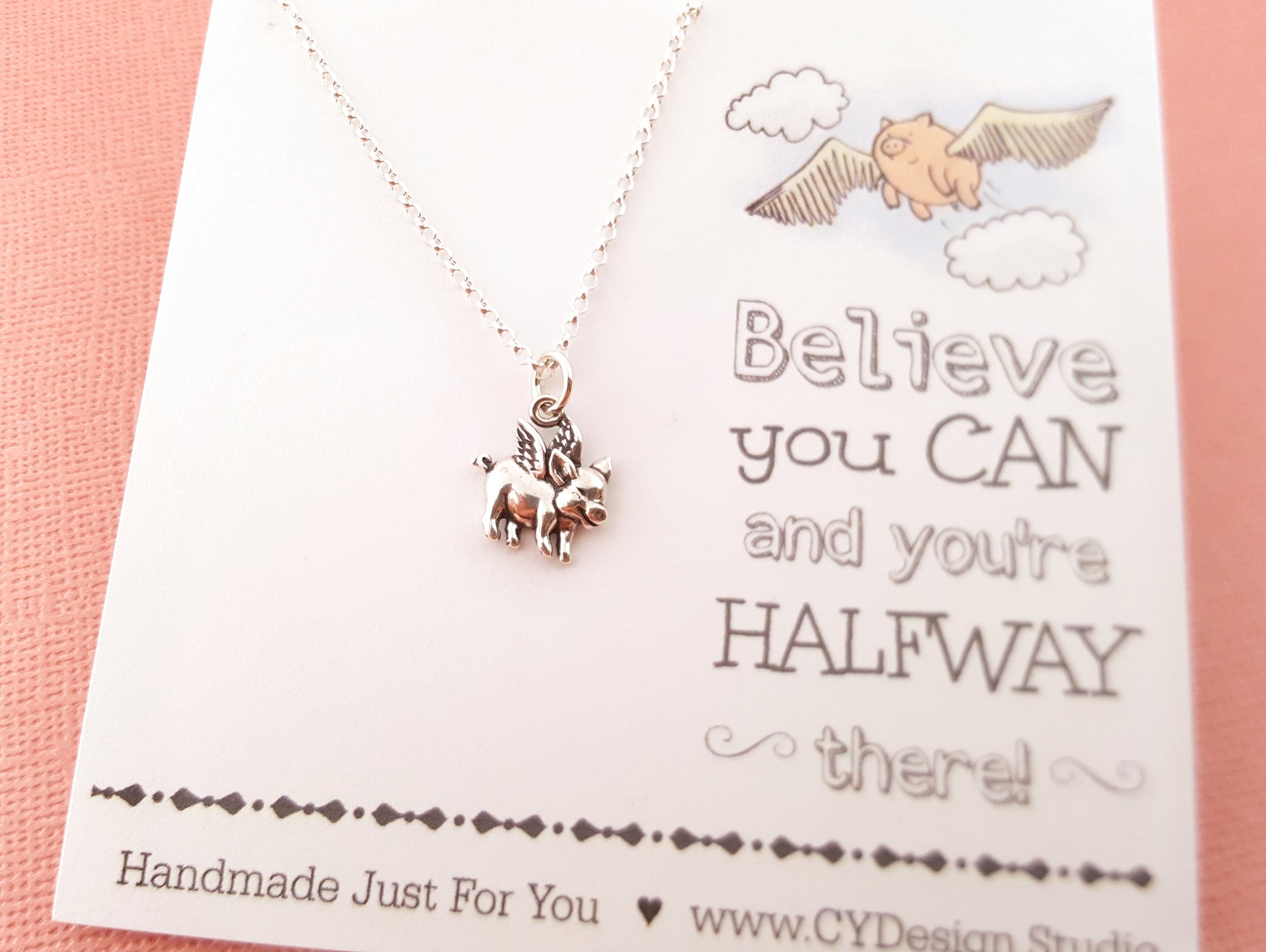 This dainty necklace is handcrafted featuring a detailed Sterling silver flying pig charm. Made with an 18 inch, premium Sterling Silver cable chain with spring ring clasp. Necklace comes with inspirational card "Believe You Can and You're Halfway There".