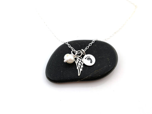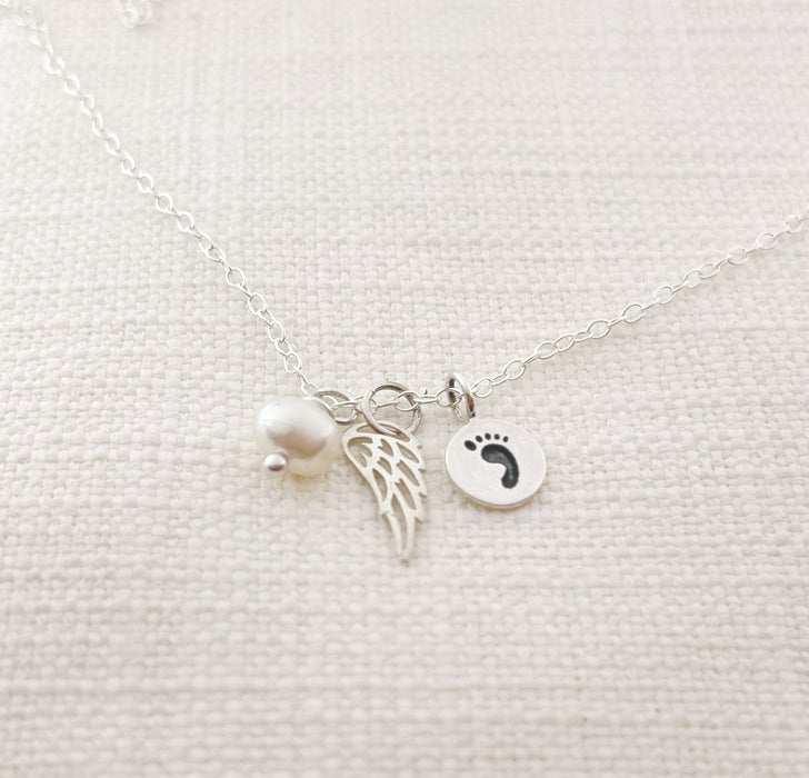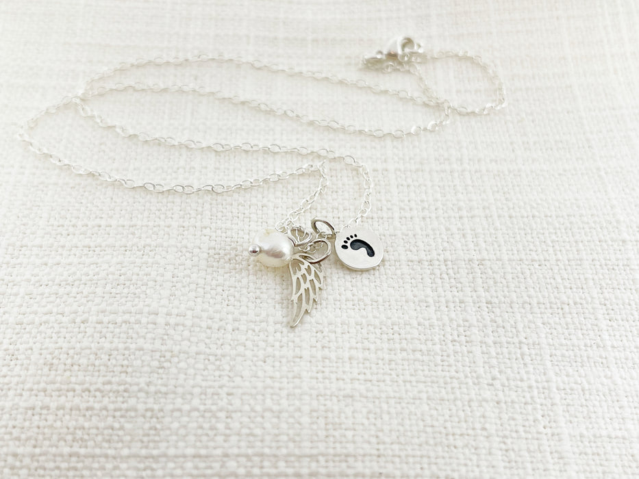 This necklace is handcrafted featuring a beautiful Sterling silver angel wing charm and a Sterling silver footprint charm, adorned by a genuine freshwater pearl wire wrapped tightly by hand. Made with shiny Sterling silver cable chain and secure lobster claw clasp.
