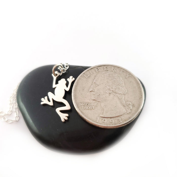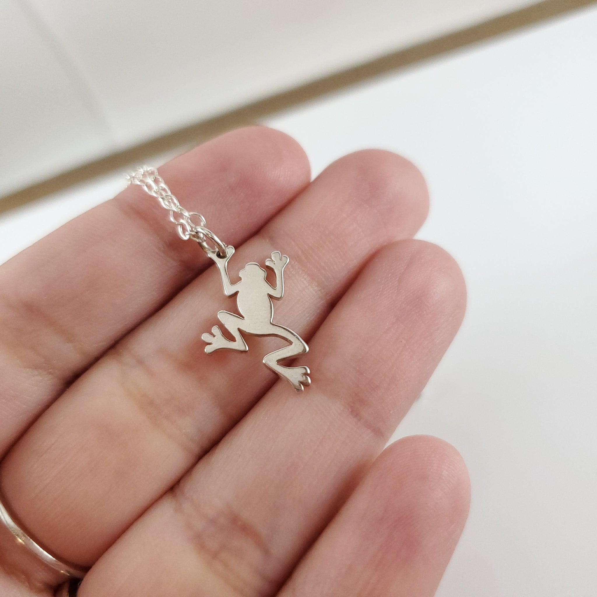 This dainty necklace is handcrafted featuring a detailed Sterling Silver Frog Charm attached to a delicate 18 inch, Sterling Silver cable chain with clasp. Necklace comes on a beautiful insert card, printed on high quality 110lb card stock.Β