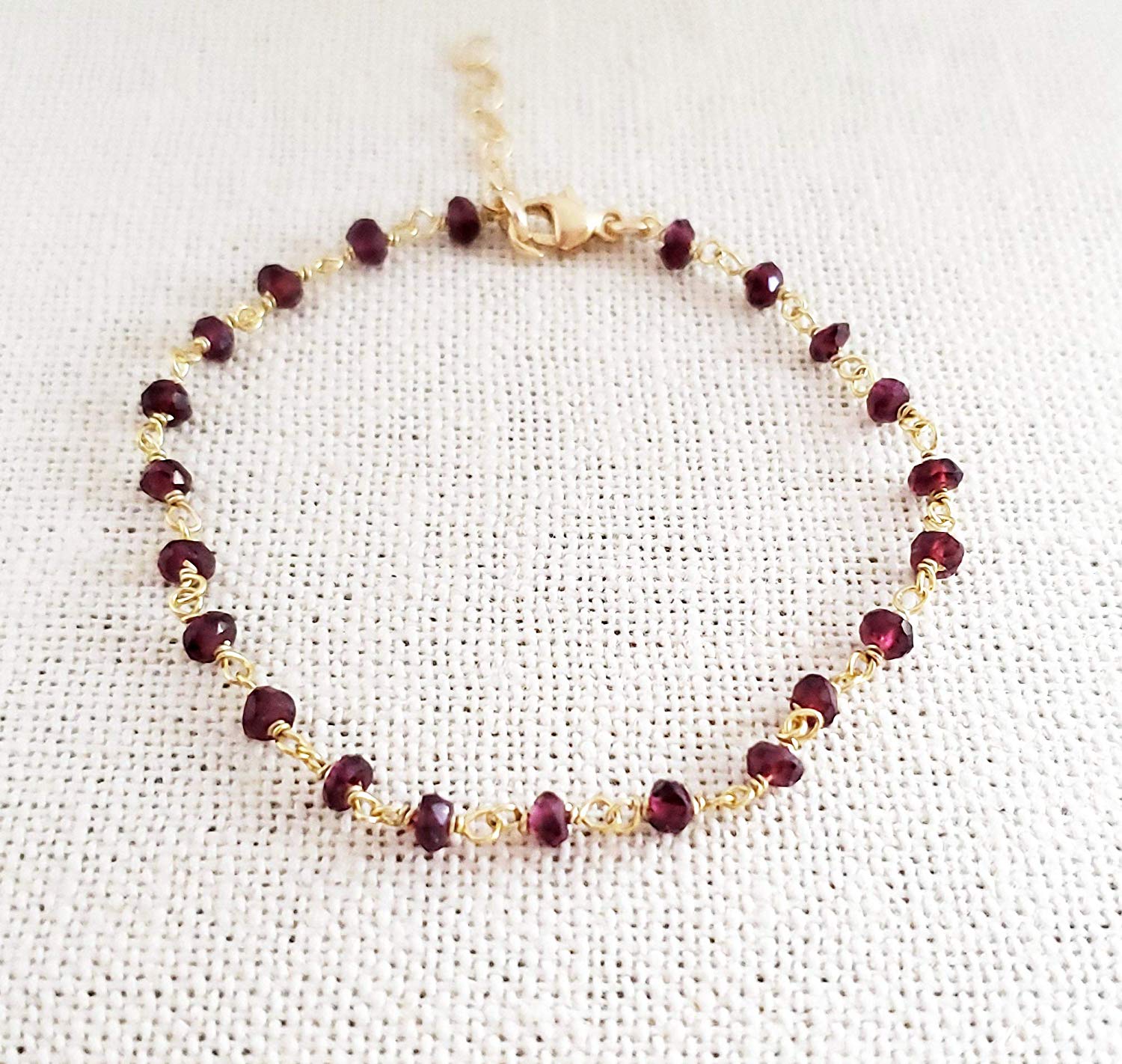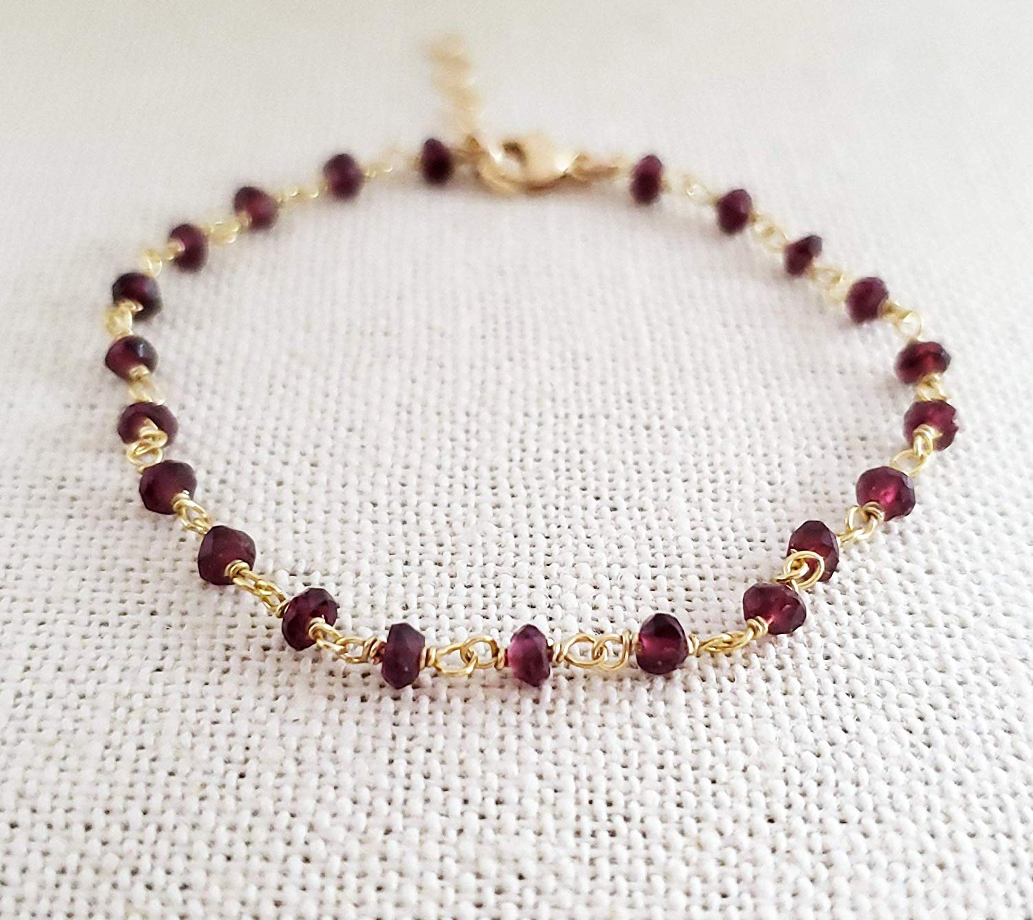 This bracelet is handcrafted featuring beautiful Garnet gemstone beads. Made with 14k gold filled wire, each gemstone is wire wrapped by hand. This bracelet is adjustable from 7 to 8 inches long with secure lobster clasp closure.
