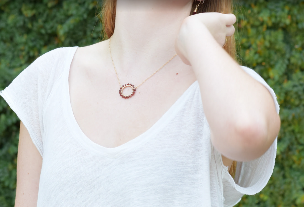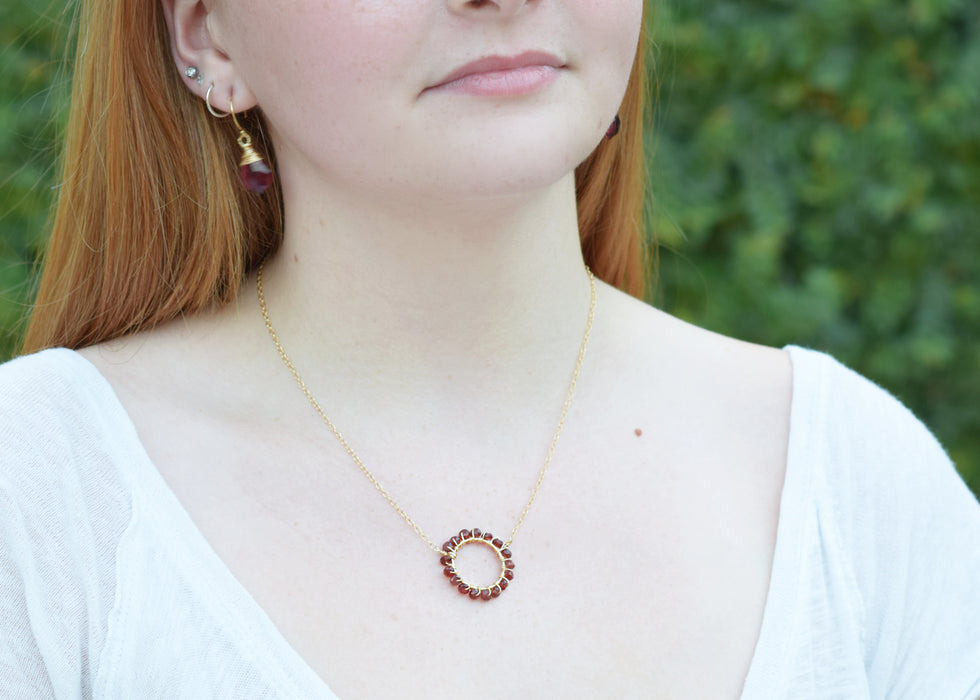 Unique halo necklace featuring shimmering garnet gemstones wire wrapped tightly by hand. Made with premium 14k gold filled chain, this necklace measures 17 inches long with secure lobster clasp.