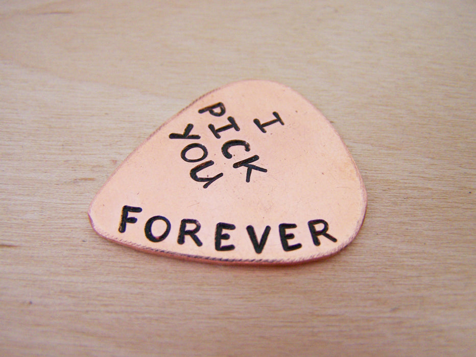 This guitar pick is hand stamped with "I Pick You Forever" into shiny raw golden brass, copper, silver tone or Sterling silver and hand painted with acrylic black paint to enhance the letters. This guitar pick measures 30 x 25 mm.