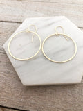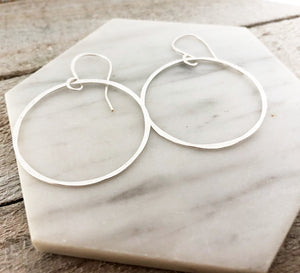 These beautiful hammered hoops are the perfect go to for everyday wear. Handmade with 20 gauge Sterling silver or 14k gold filled wire, these earrings measure 1.5 inches in diameter.