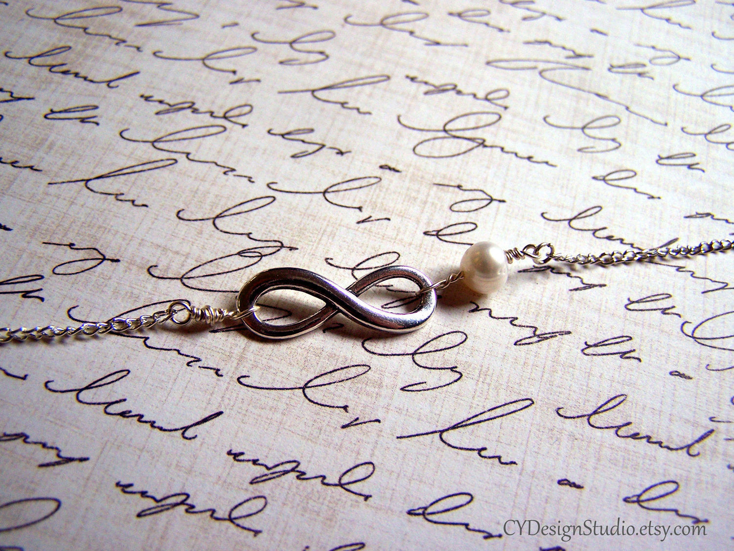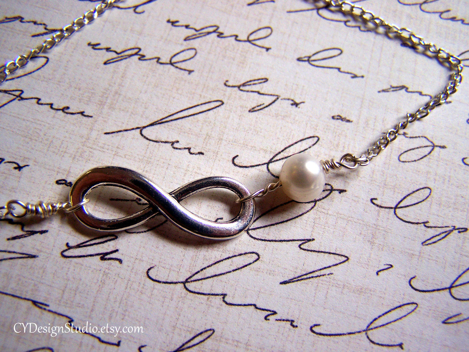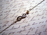 This timeless necklace features an Antiqued Tibetan silver infinity love charm adorned by a shimmering, genuine freshwater pearl. Wire wrapped by hand using Sterling silver jeweler's wire. Made with a 925 Sterling silver chain with secure lobster clasp closure, this necklace measures 18 inches long.
