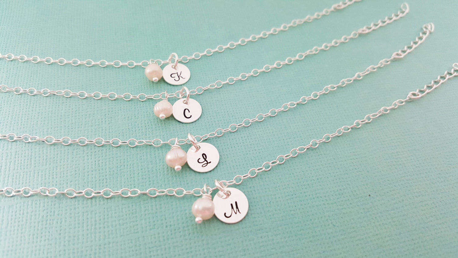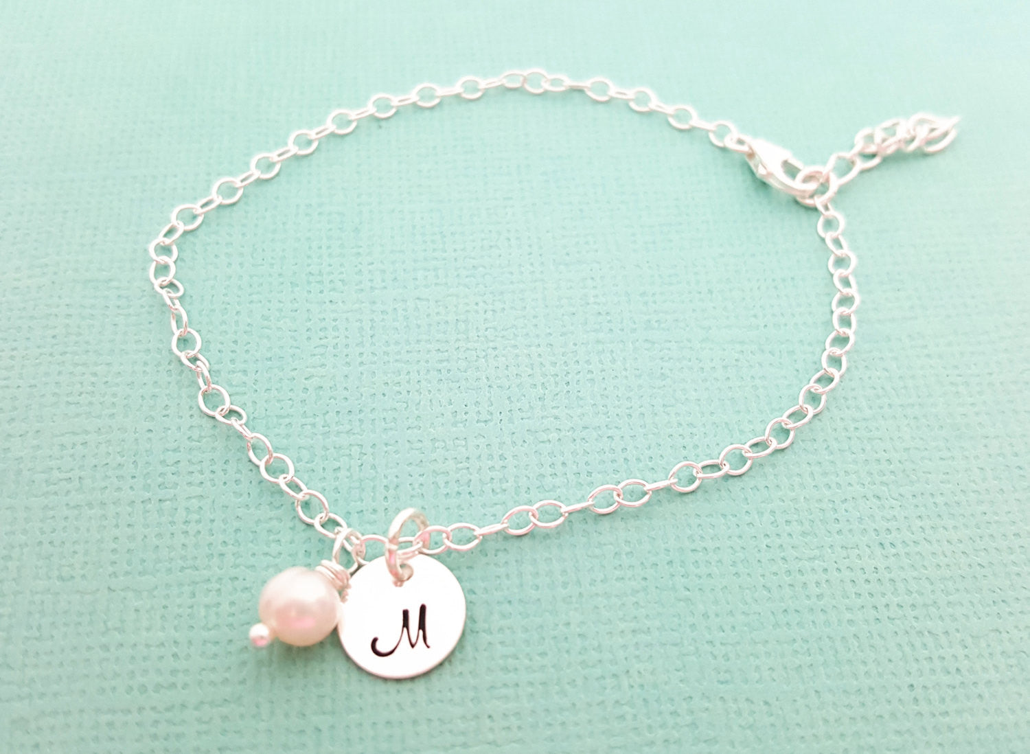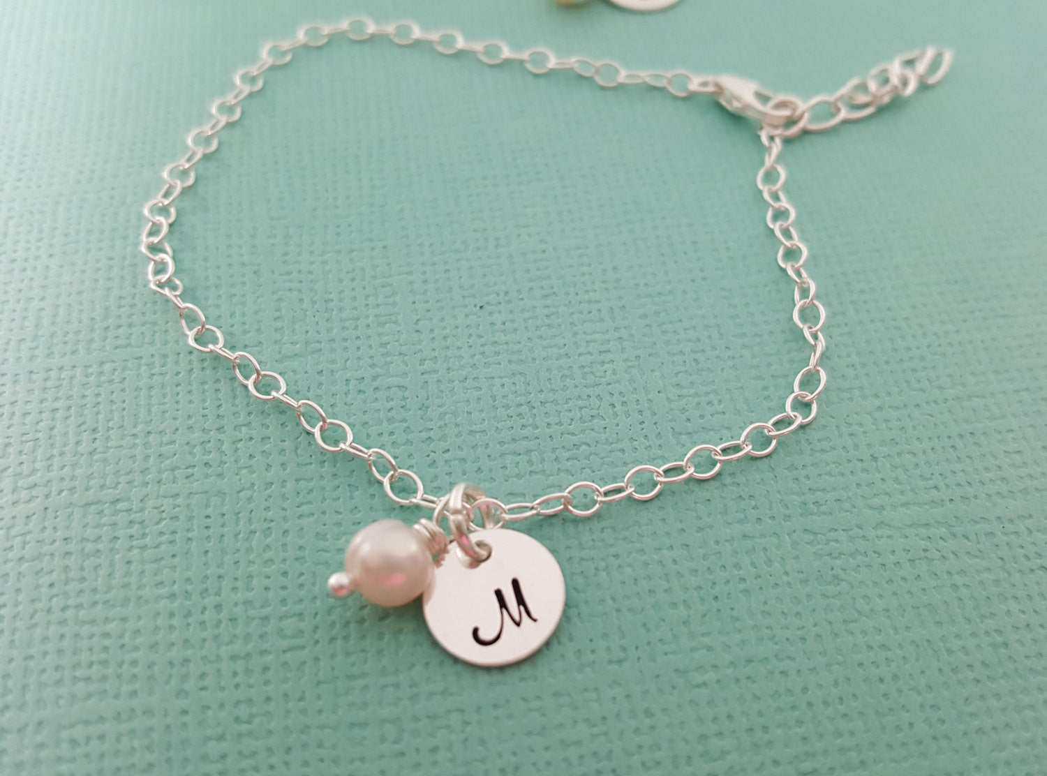 This dainty bracelet is handcrafted featuring a dainty 9mm Sterling silver disc hand stamped with your initial, and adorned by a genuine freshwater pearl wire wrapped by hand. Made with Sterling silver chain and Sterling silver secure lobster clasp closure. This bracelet is made to be adjustable from 7 to 8 inches in length. If you need another size, please contact me for a custom order!
