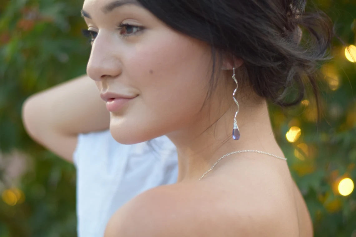 These dainty earrings are handcrafted featuring Iolite Quartz wire wrapped tightly by hand with 925 Sterling silver jewelers wire, attached to simple sterling silver ear wires.
