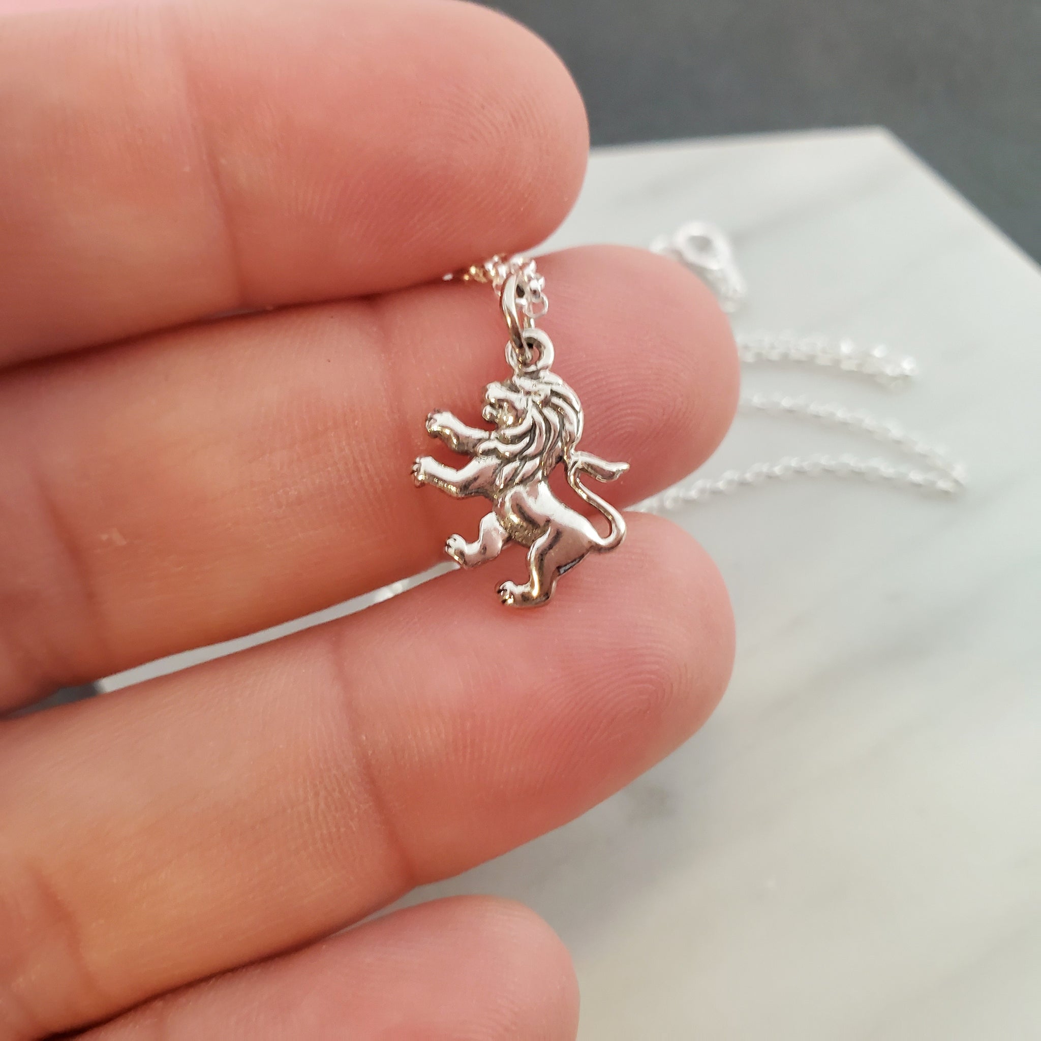 This dainty necklace is handcrafted featuring a detailed Sterling Silver Lion charm attached to a delicate 18 inch, Sterling Silver cable chain with clasp. Necklace comes on a beautiful insert card, printed on high quality 110lb card stock.
