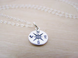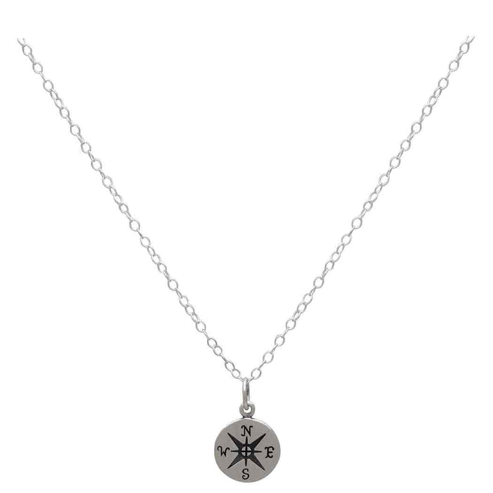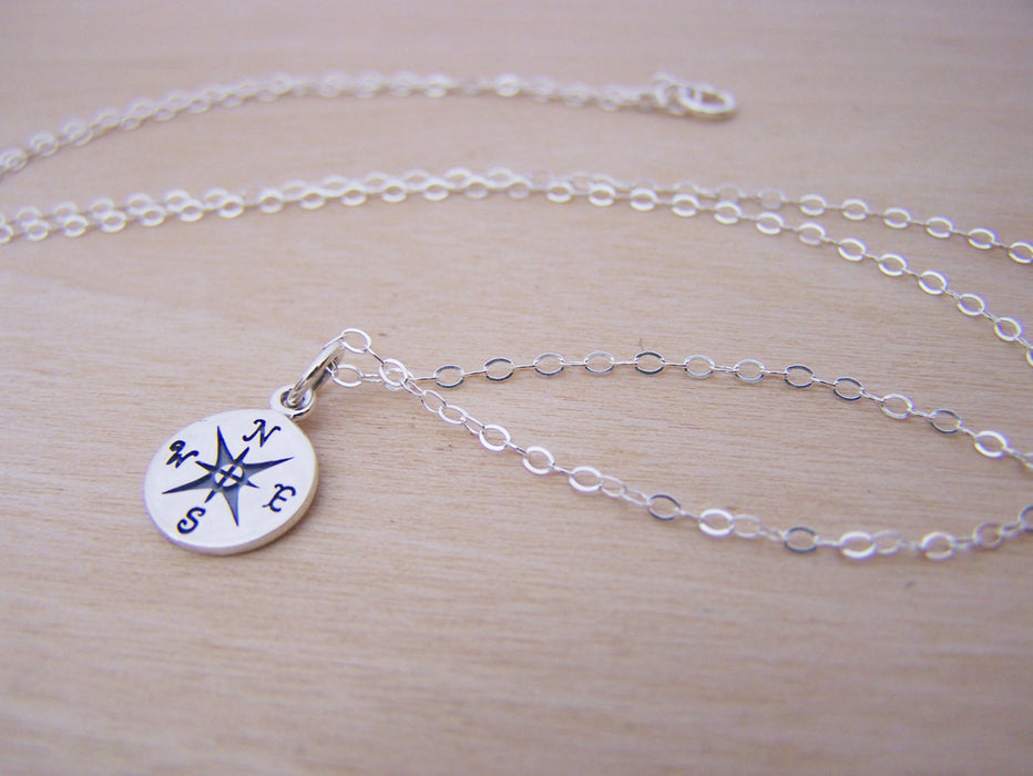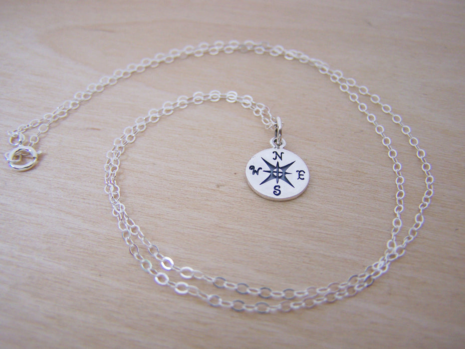 This dainty necklace is handcrafted featuring an adorable compass charm of Sterling silver. Attached to an 18 inch Sterling silver cable chain with secure spring ring clasp.