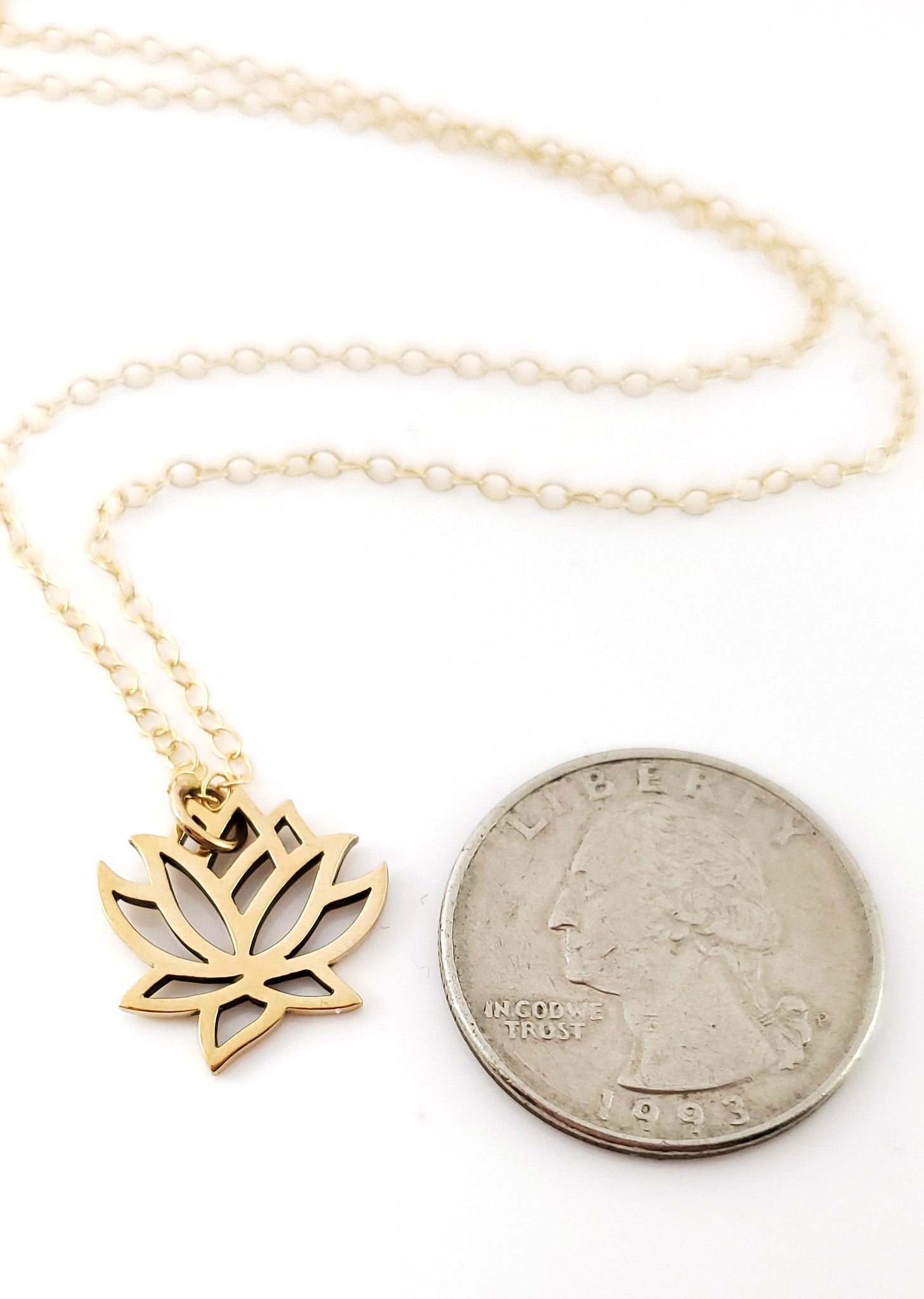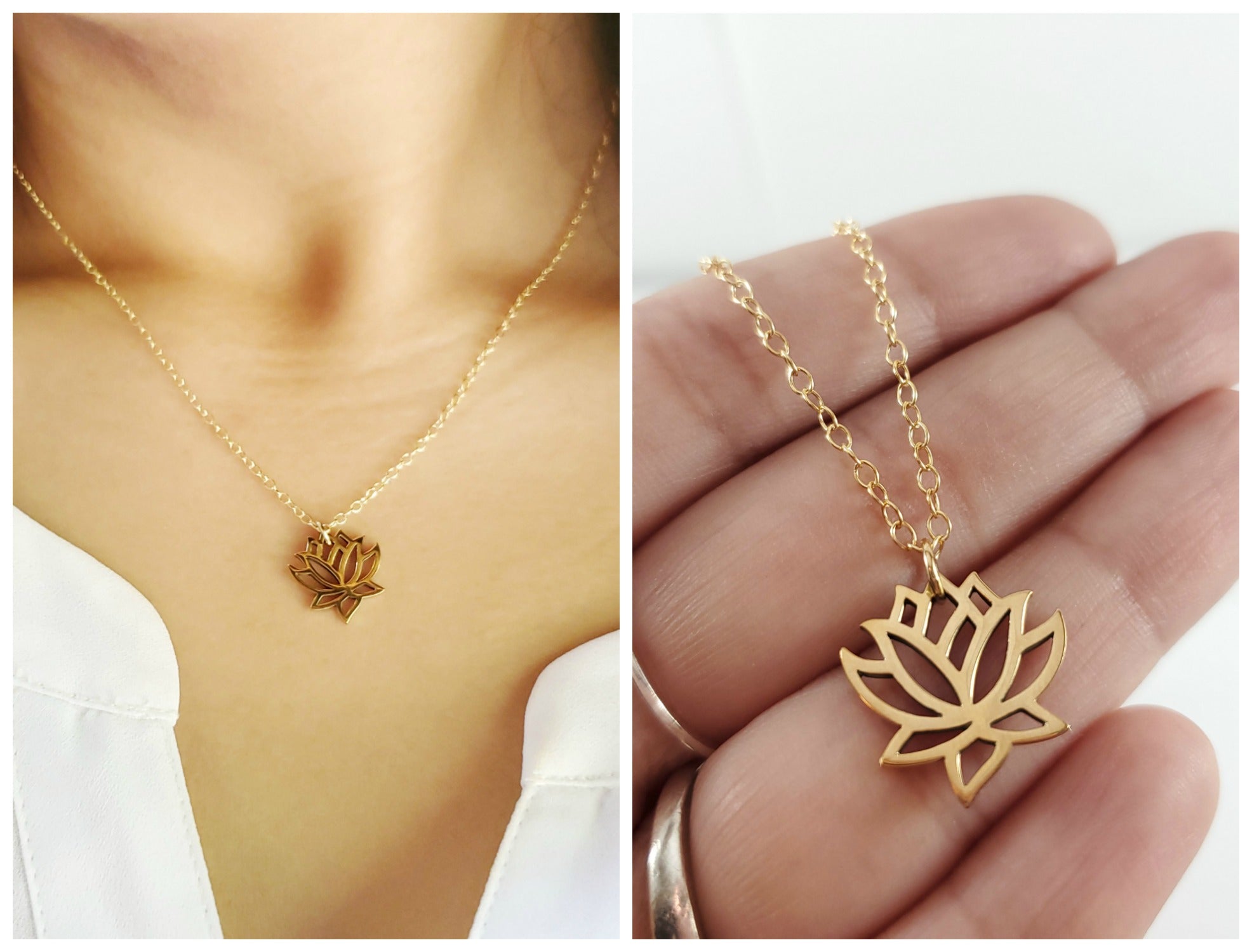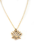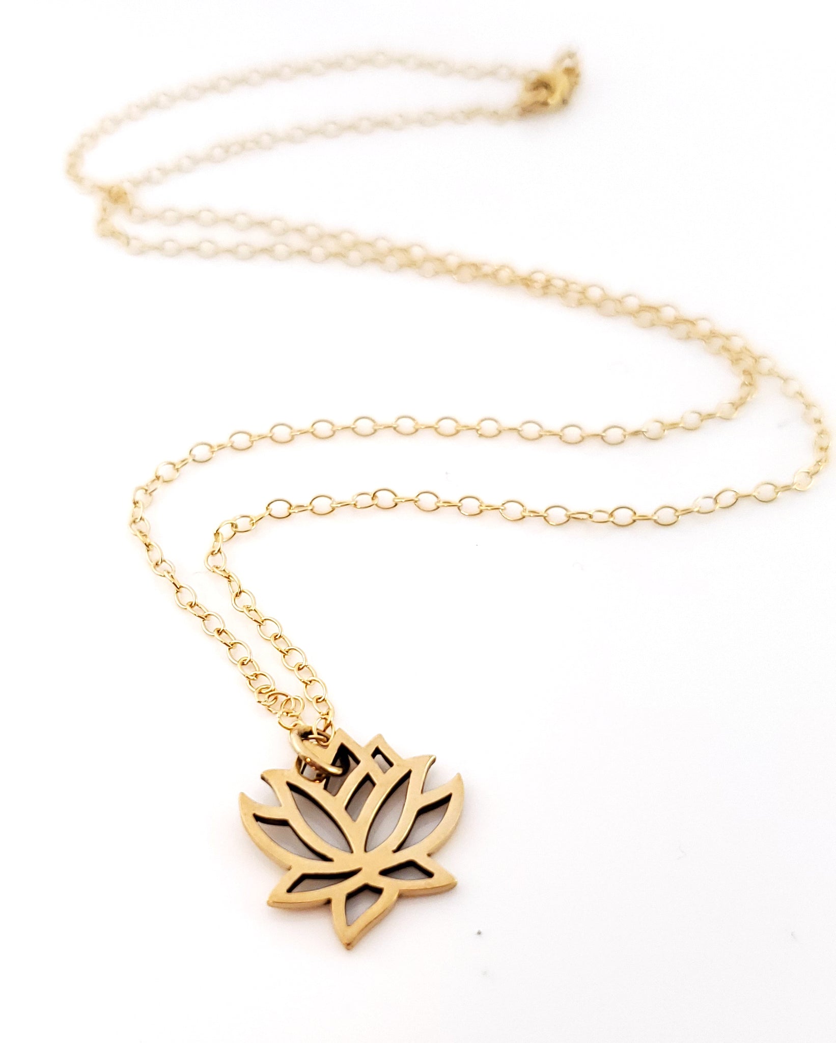 This dainty necklace is handcrafted featuring a detailed Lotus Flower charm attached to a delicate 16 inch, 14k gold filled cable chain with clasp. Necklace comes on a beautiful insert card, printed on high quality 110lb card stock.