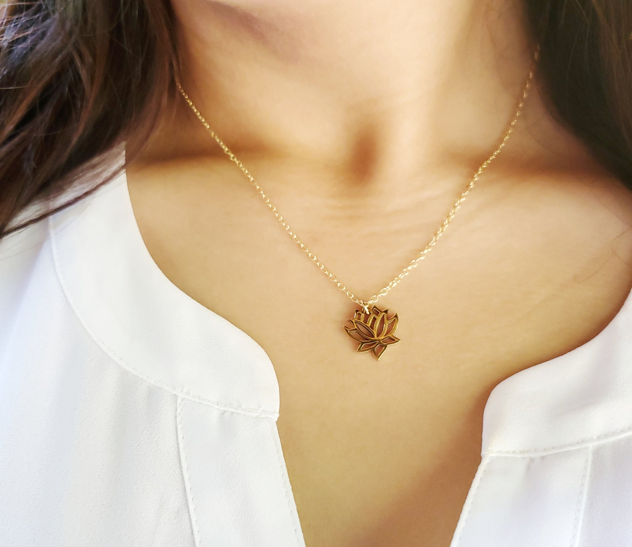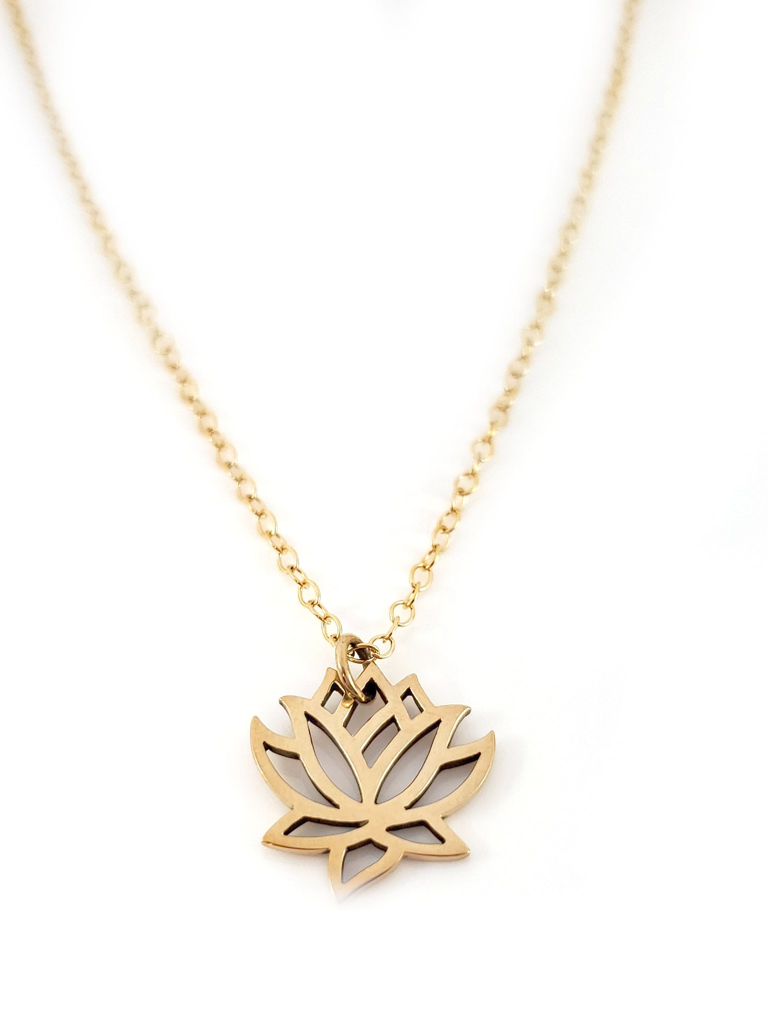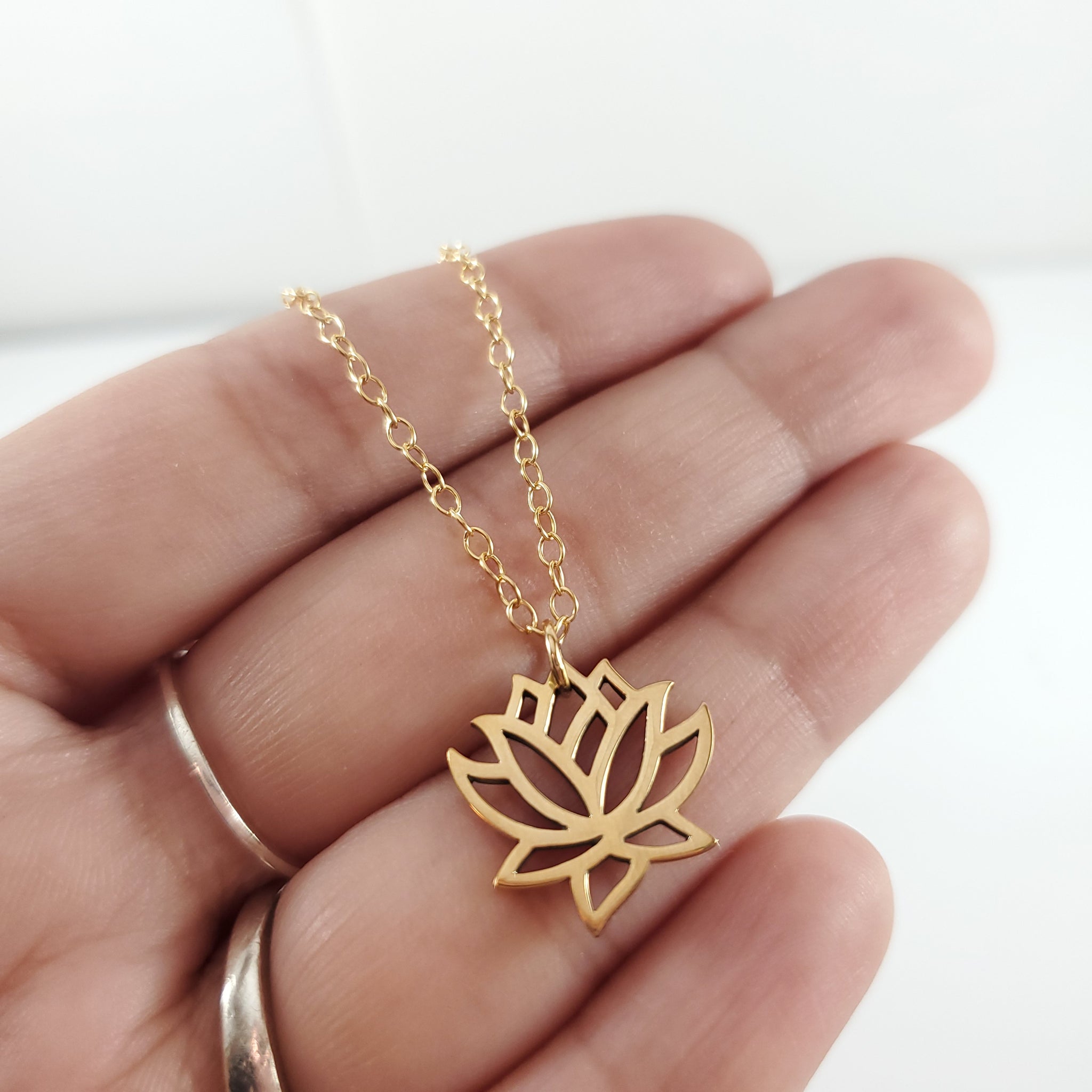 This dainty necklace is handcrafted featuring a detailed Lotus Flower charm attached to a delicate 16 inch, 14k gold filled cable chain with clasp. Necklace comes on a beautiful insert card, printed on high quality 110lb card stock.