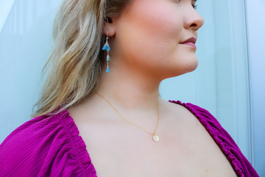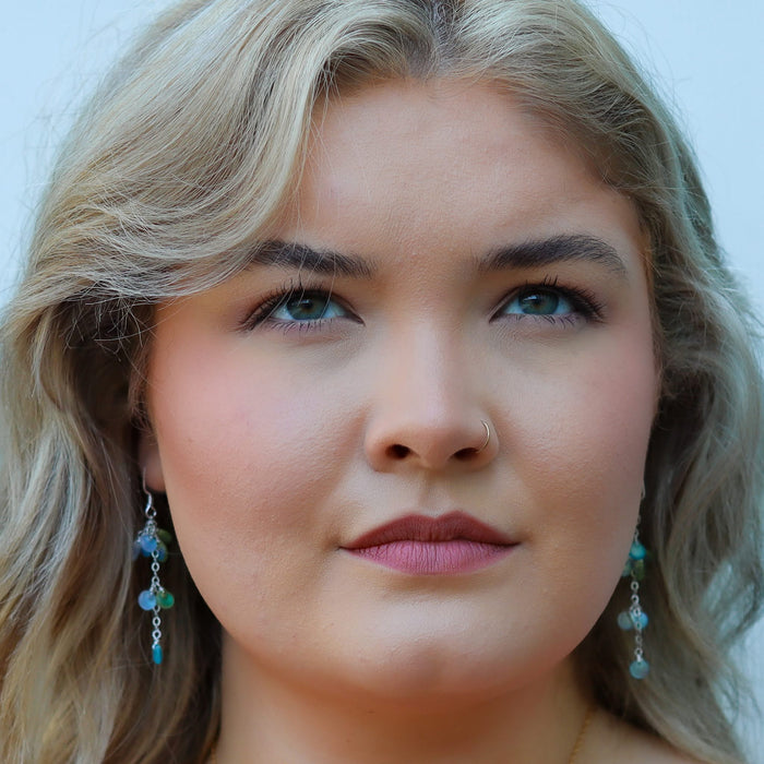 These earrings are handcrafted featuring shimmering sea glass "scales" in a beautiful cluster and dangle pattern on Sterling silver chain.  These earrings measure 2.5 inches long from Sterling Silver earwires.