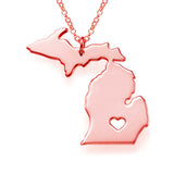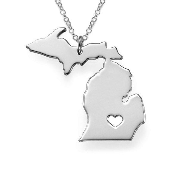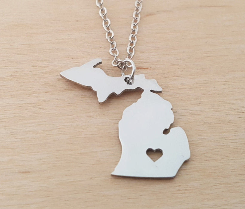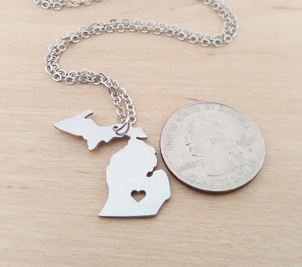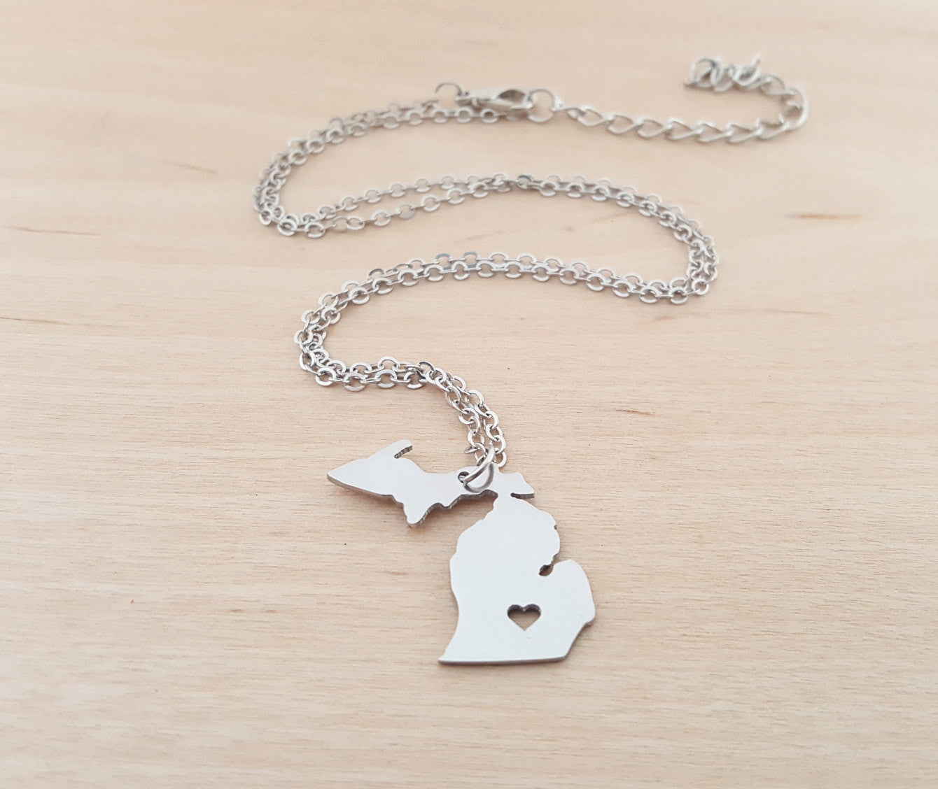 This necklace is handcrafted featuring a detailed Stainless steel Michigan charm, with heart cut out, attached to a stainless steel or plated stainless steel chain, adjustable from 17 to 19.5 inches long. I cannot move the heart's location on the pendant.