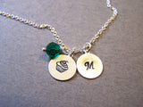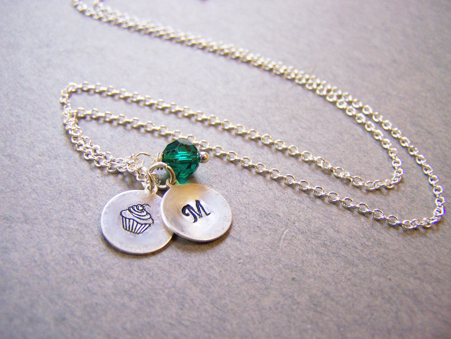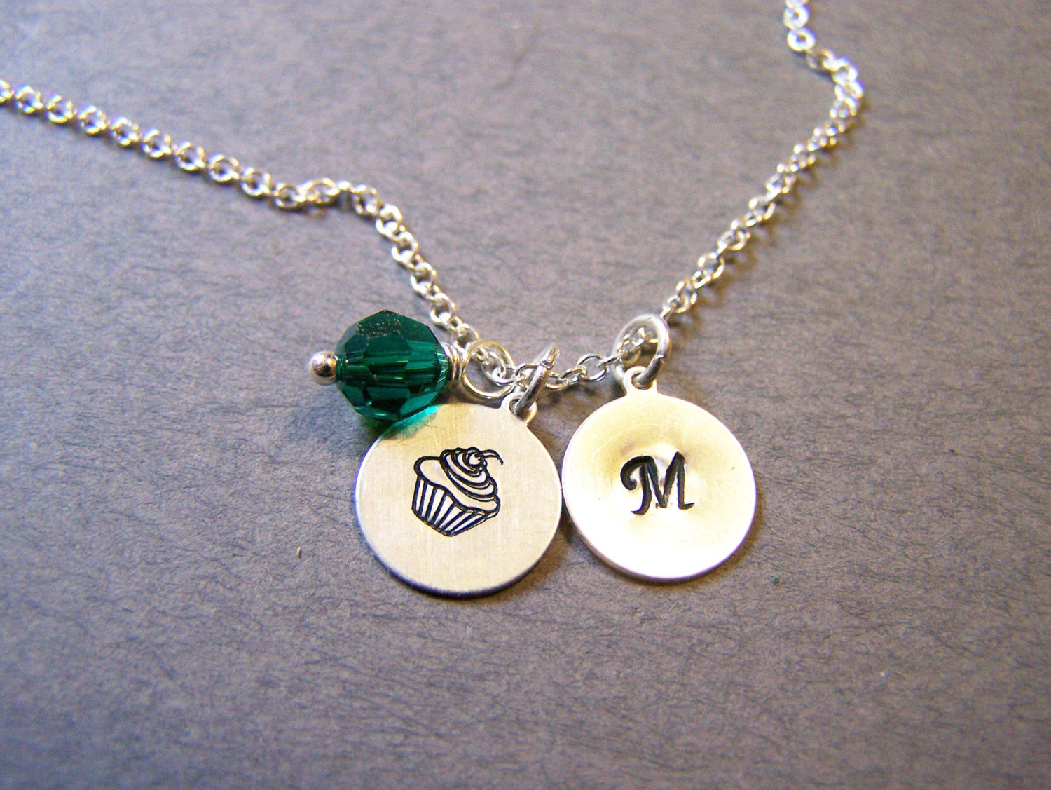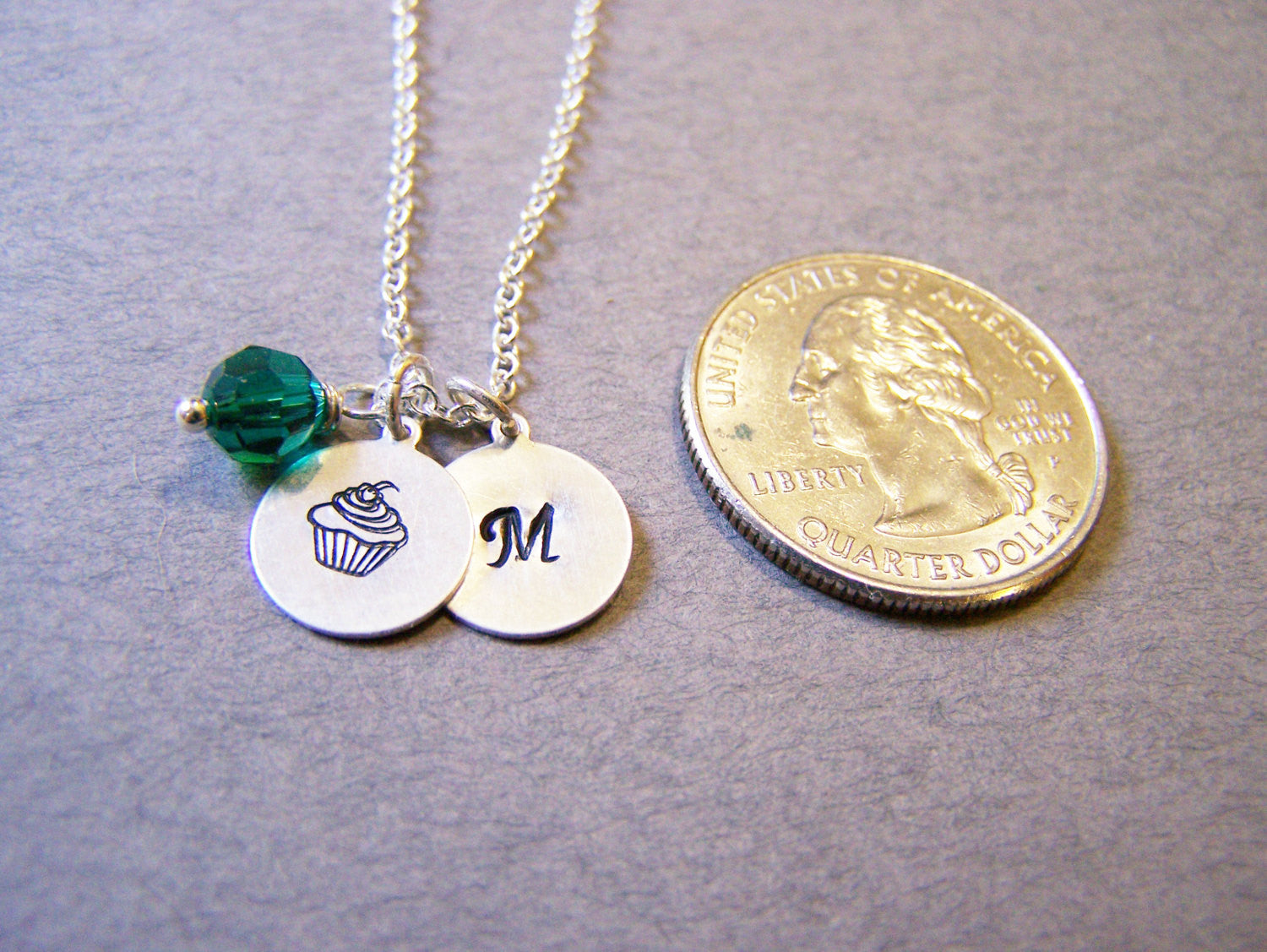 This necklace is handcrafted featuring a dainty Sterling silver charm hand stamped with your initial, and adorned by a shimmering Swarovski crystal birthstone, wire wrapped by hand and a hand stamped cupcake birthday Sterling silver charm. Attached to an 18 inch 925 Sterling silver chain with secure lobster clasp closure. Sterling silver initial stamps measure 1 cm in diameter. Swarovski crystals are 6mm.