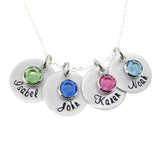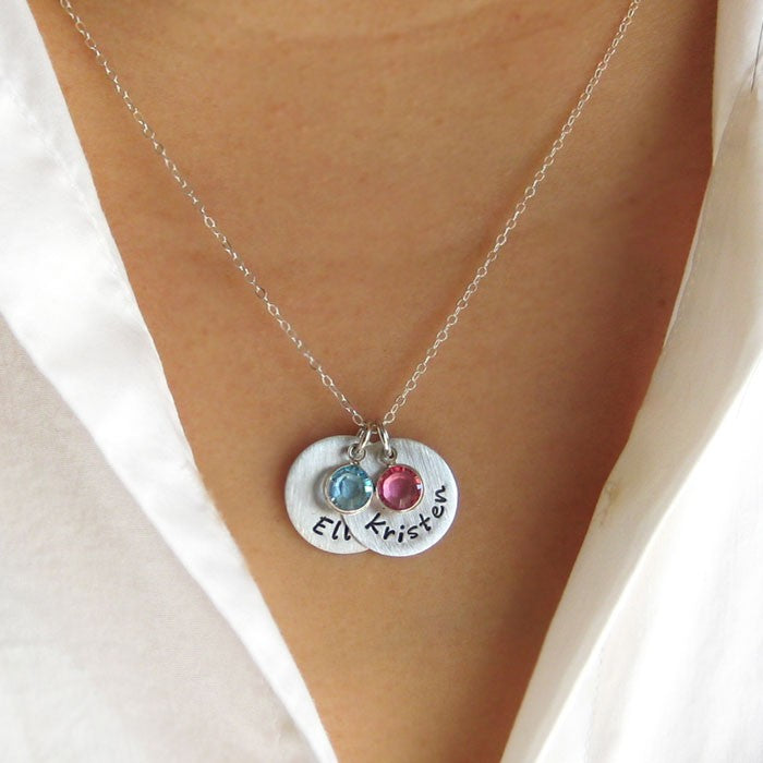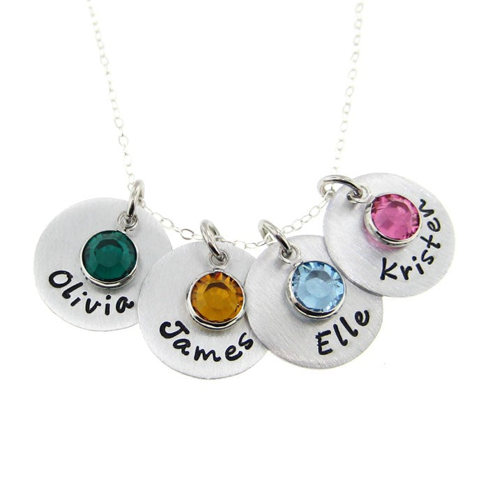 This necklace is handcrafted featuring a 17.5mm aluminum disc hand stamped with your name and adorned with a Swarovski channel birthstone drop. Attached to an 18 inch Sterling silver cable chain with secure spring ring clasp. Aluminum pendant will not tarnish.