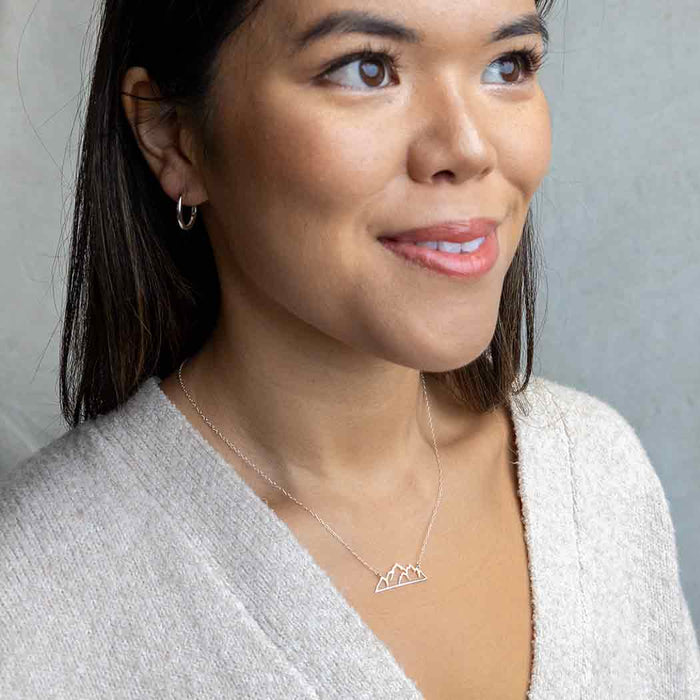 Nature lovers and outdoor enthusiasts will love this mountain necklace featuring the silhouette of distant mountains. Just seeing the peaks and valleys on this charm will transport you back to the wilderness, out of the hustle and bustle of city life, to that place you found peace, relaxation, and space to breathe. No matter your adventure of choice - skiing, camping, hiking - this mountain necklace will take you back to that cool mountain air.