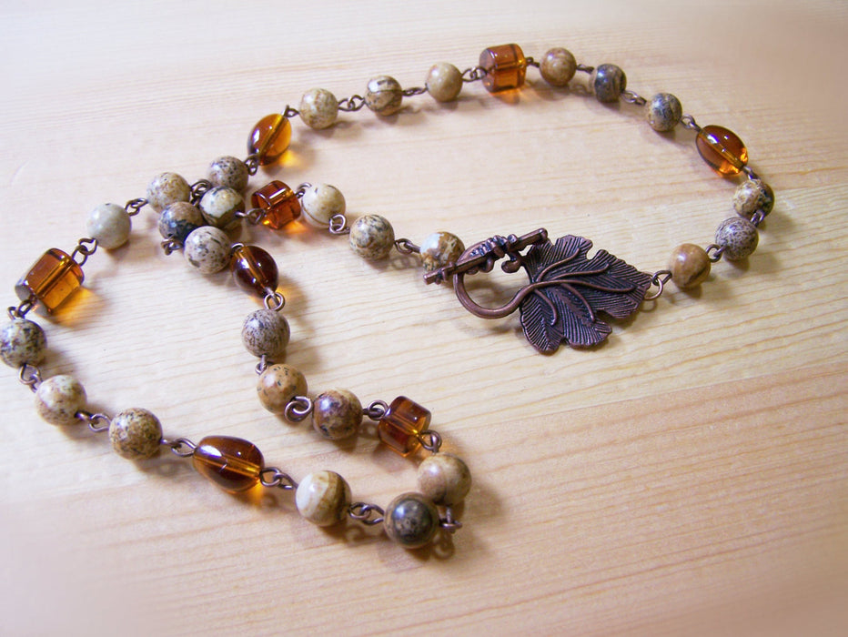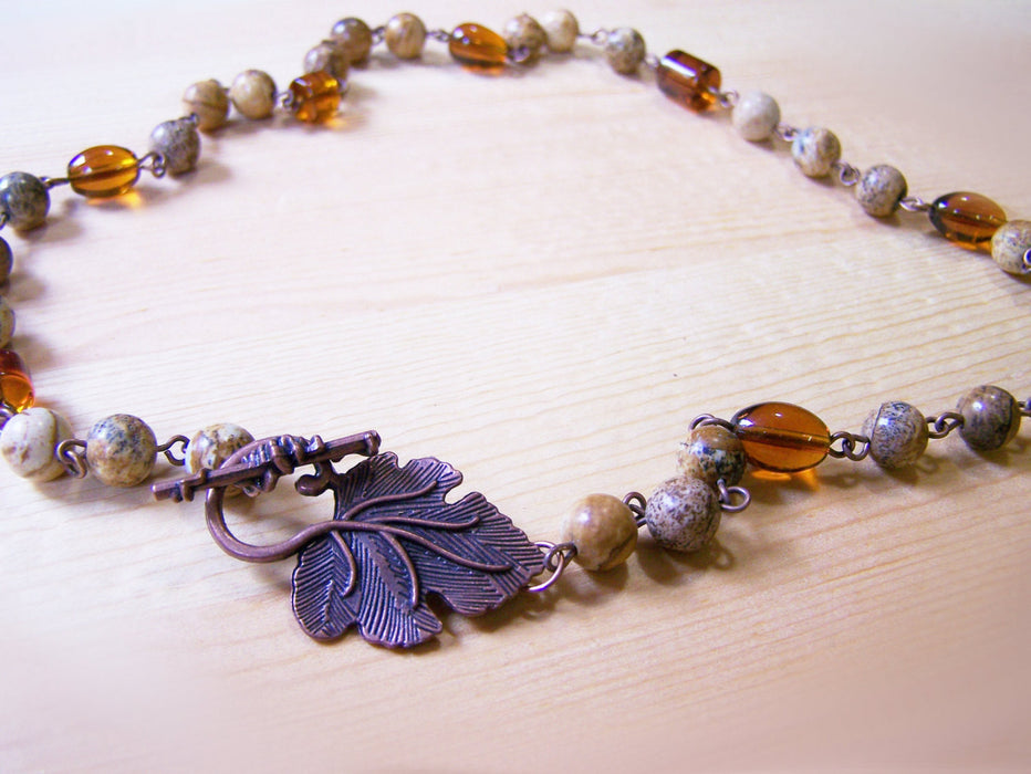 This necklace is hand crafted featuring earthy natural jasper stones and honey amber glass beads, individually attached by hand with copper findings and closed with a beautiful detailed copper leaf toggle clasp. This necklace measures 25 inches long.
