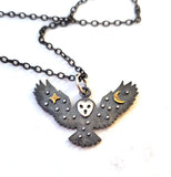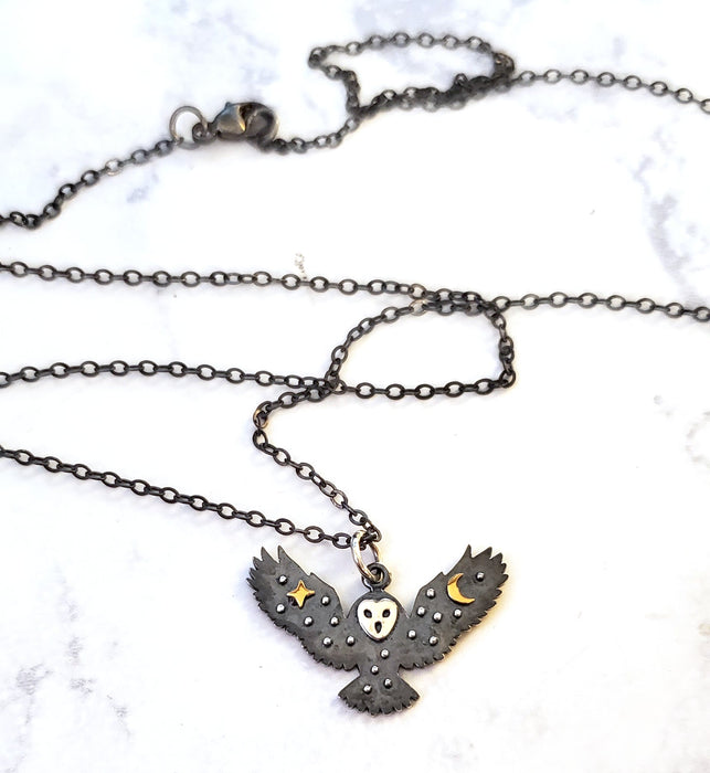 This necklace is handcrafted featuring a gorgeous detailed owl pendant in oxidized Sterling Silver with gold bronze stars and moon accents. Attached to an 18 inch oxidized Sterling Silver chain with secure lobster clasp.
