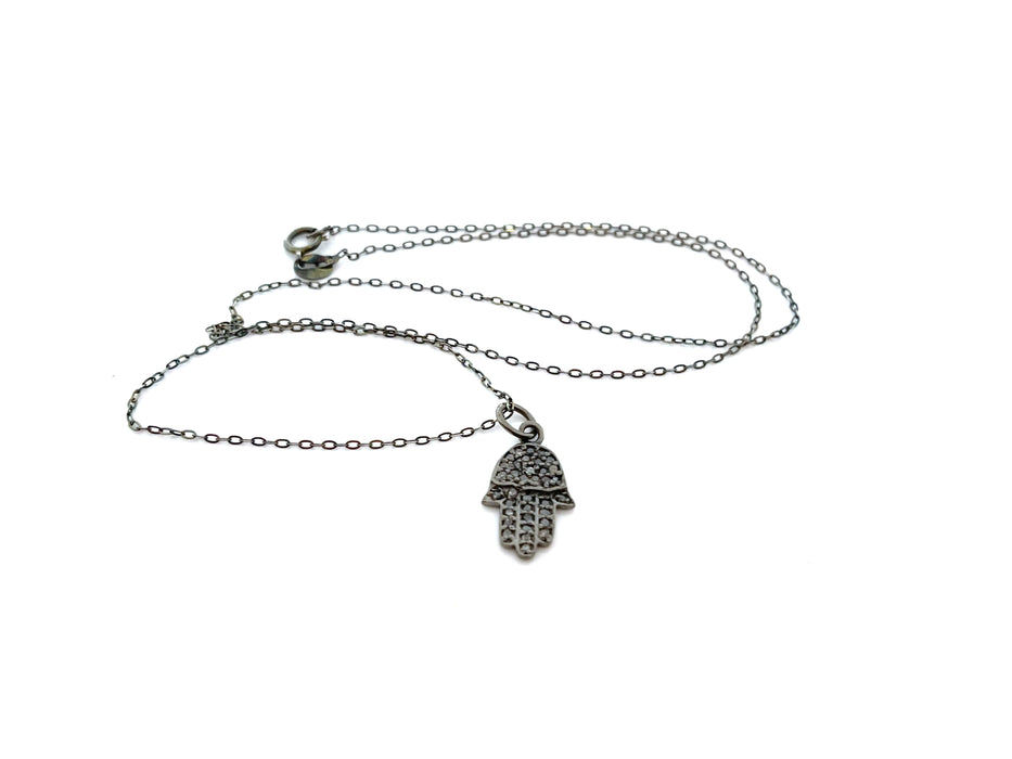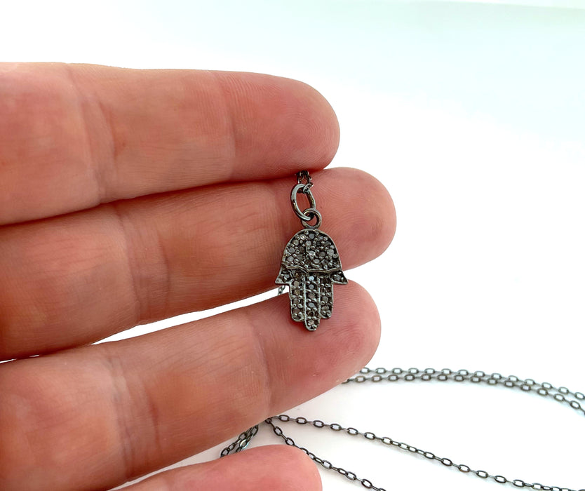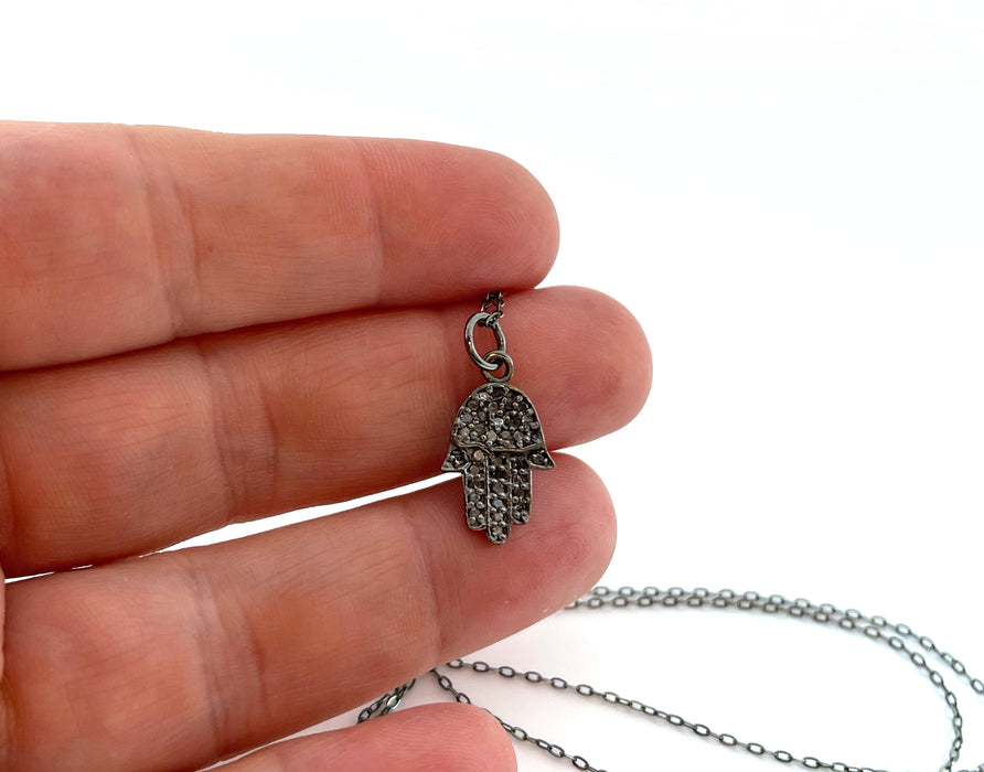 Pave Diamond Hamsa Hand Oxidized Sterling Silver Necklace