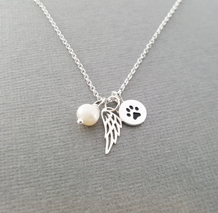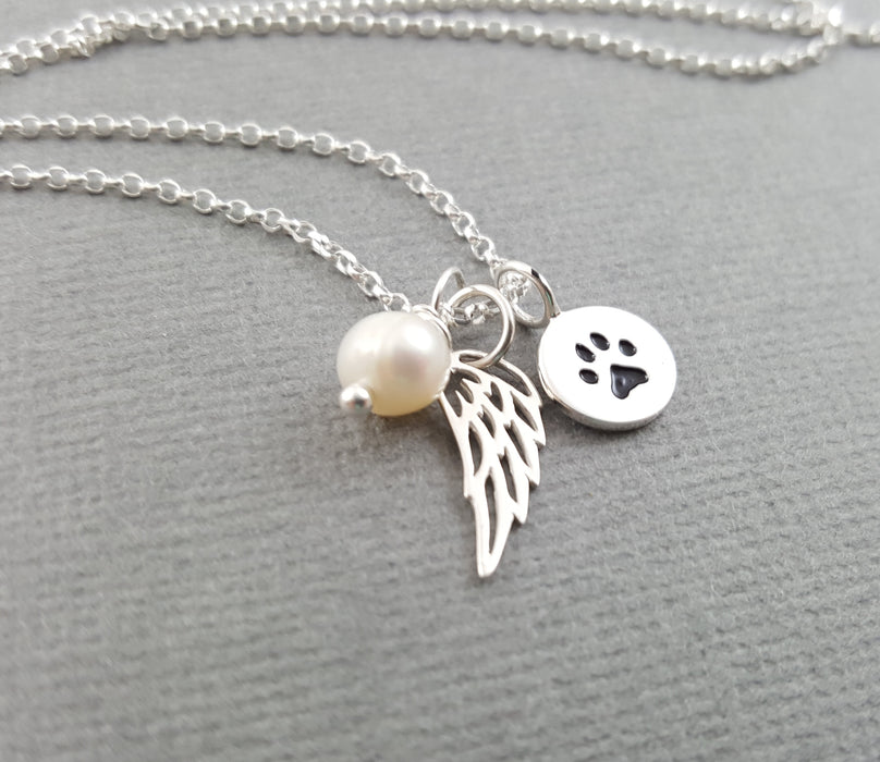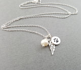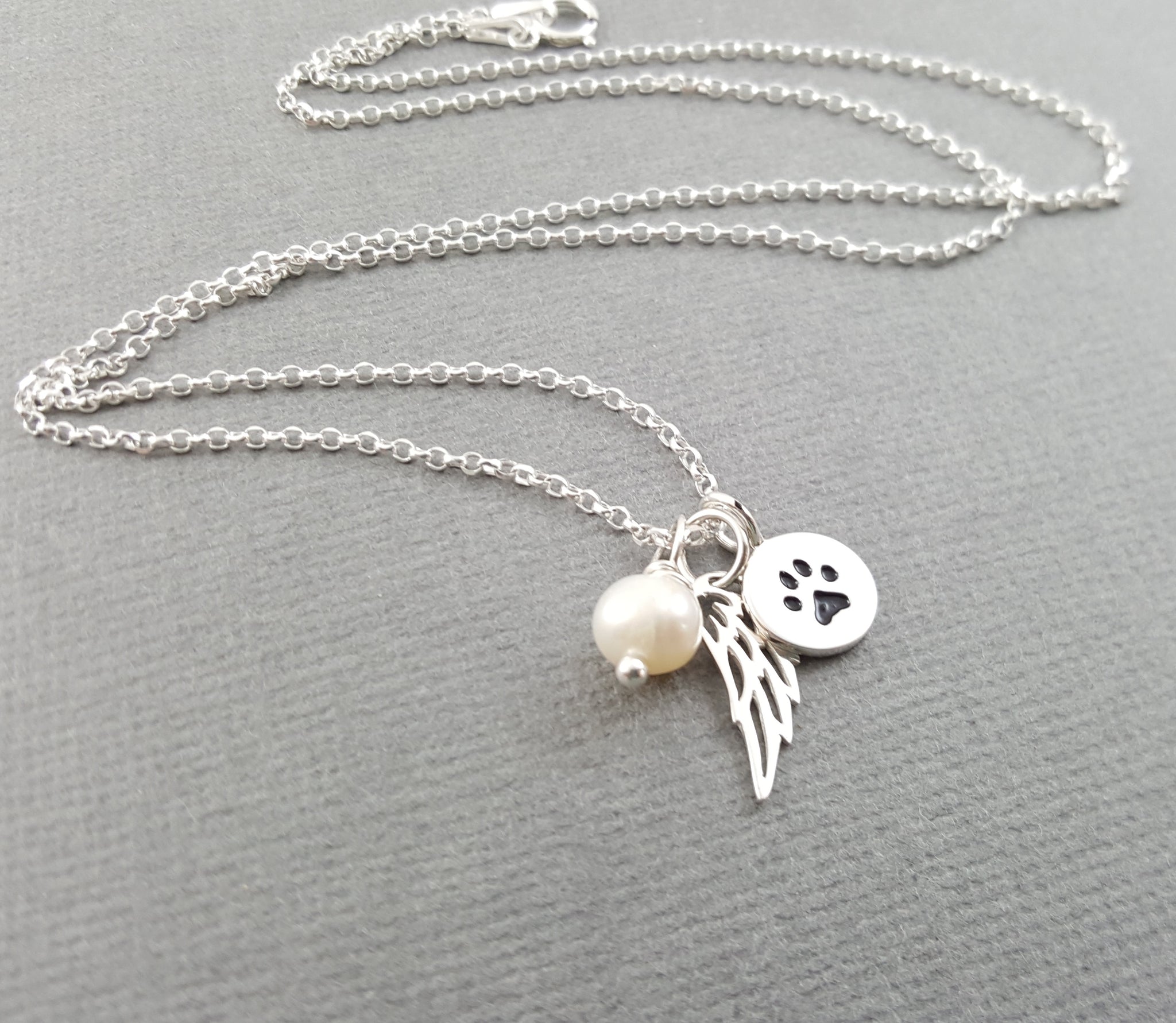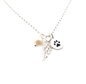 Angel wing necklaces are a subtle and sophisticated way to remember the loss of a loved pet. Each of these paw print angel wing necklaces will be made with expertise and grace. This necklace is handcrafted featuring a beautiful Sterling Silver angel wing charm adorned by a genuine freshwater pearl and petite Sterling Silver disc, engraved with a sweet little paw print. Made with shiny Sterling Silver cable chain and secure spring ring clasp, this necklace measures 18 inches long.Β