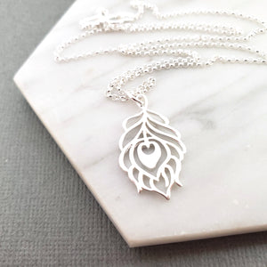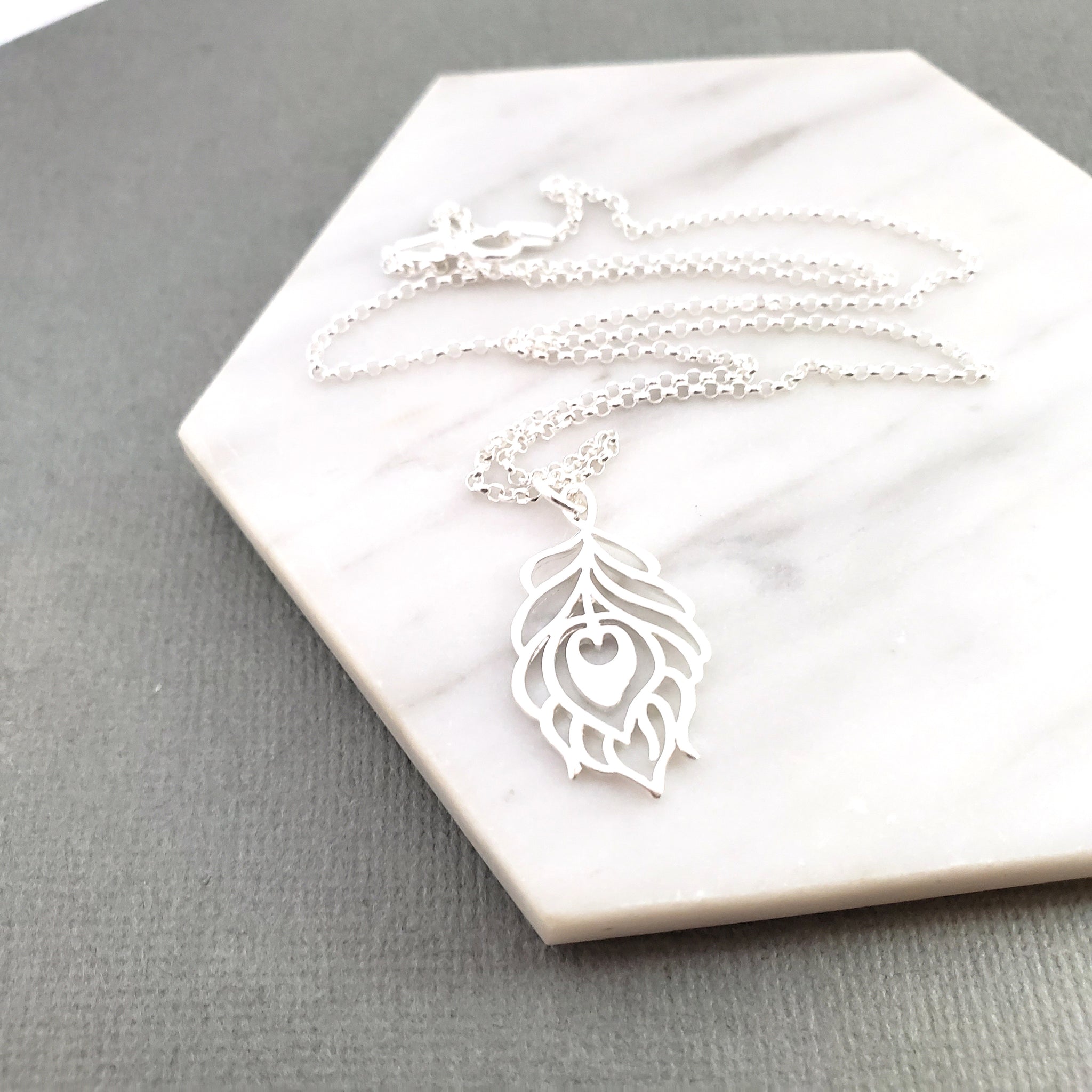This dainty necklace is handcrafted featuring a detailed Sterling Silver Peacock Feather charm attached to a delicate 18 inch, Sterling Silver cable chain with clasp. Necklace comes on a beautiful insert card, printed on high quality 110lb card stock.Β