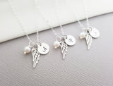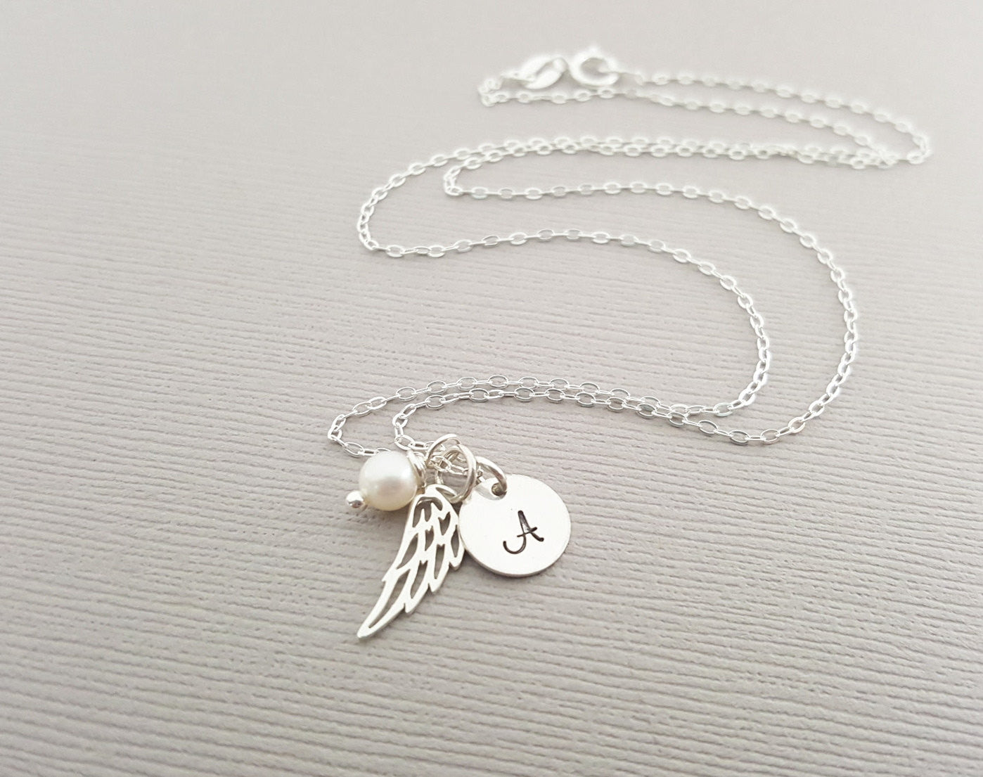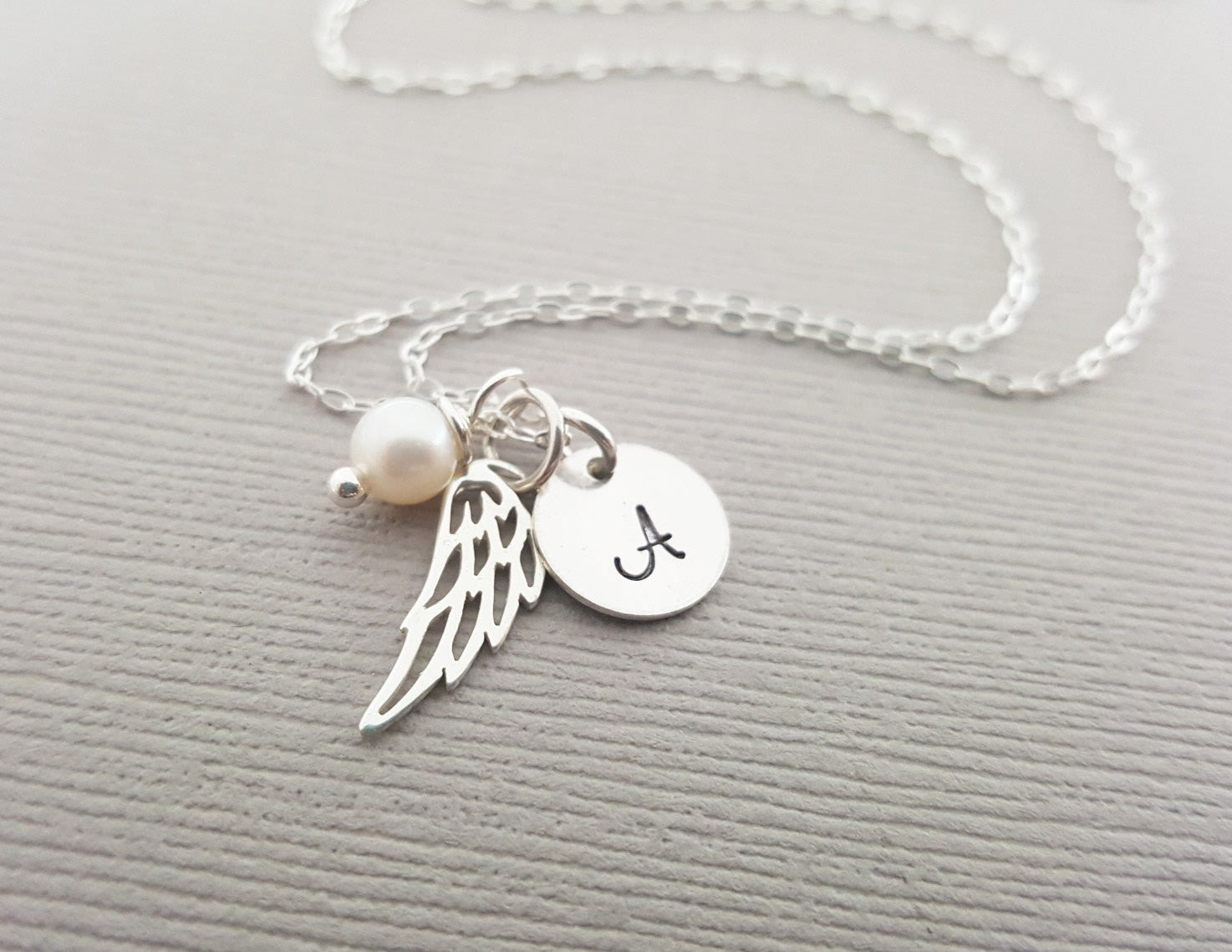 This necklace is handcrafted featuring a beautiful Sterling silver angel wing charm adorned by a genuine freshwater pearl and petite Sterling Silver disc, hand stamped with your initial. Made to order to your specified length with shiny Sterling Silver chain and secure spring ring clasp.