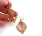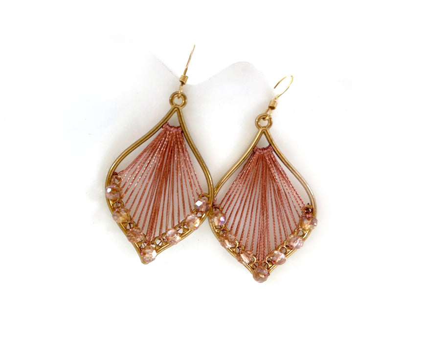 These earrings are handcrafted featuring gold plated leaf pendants wrapped with pink thread and adorned with sparkling faceted crystal beads.Β These earrings measure 1.5 inches long from base of 14k gold filled earwires.