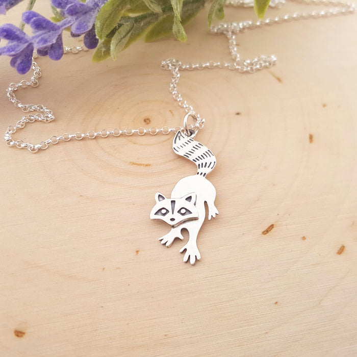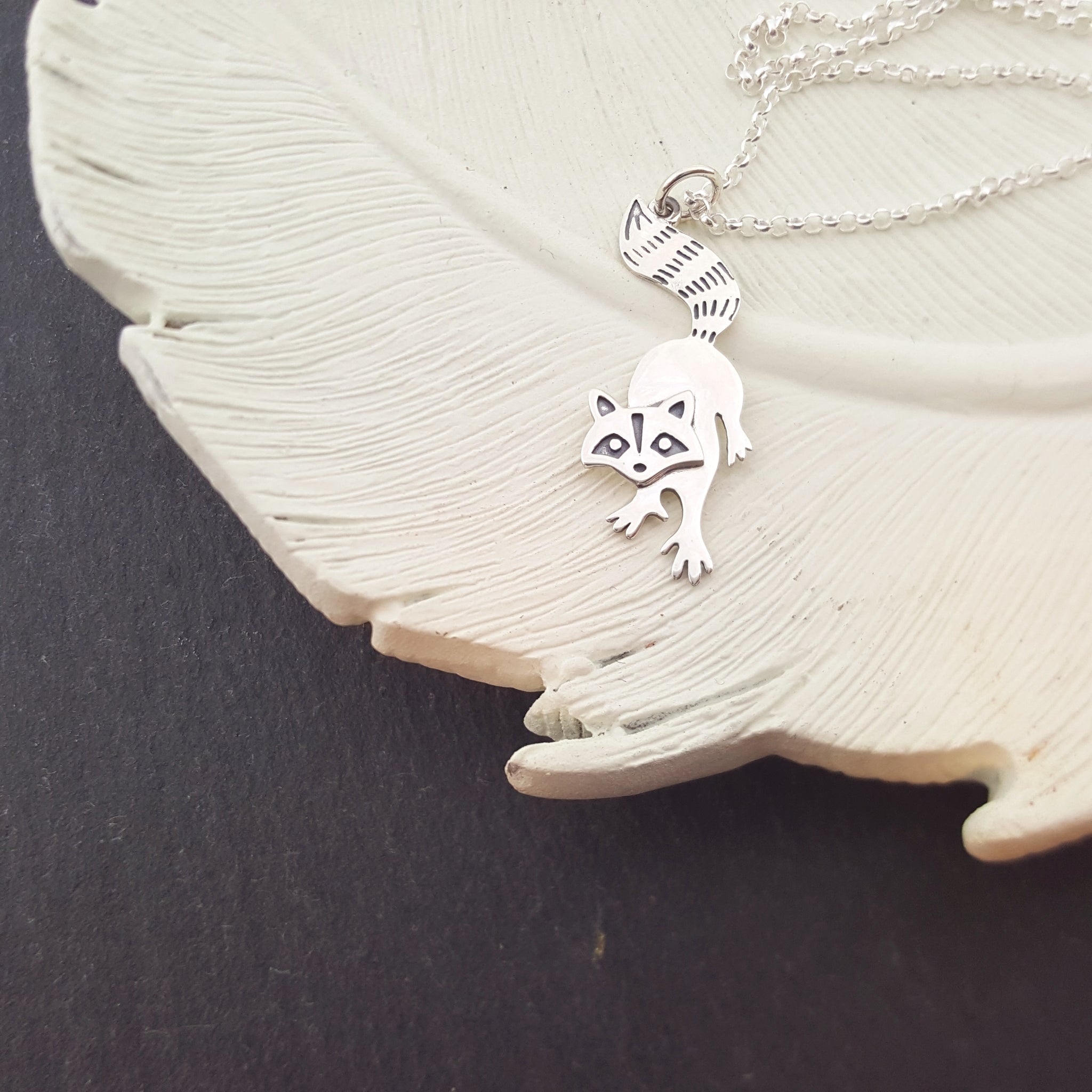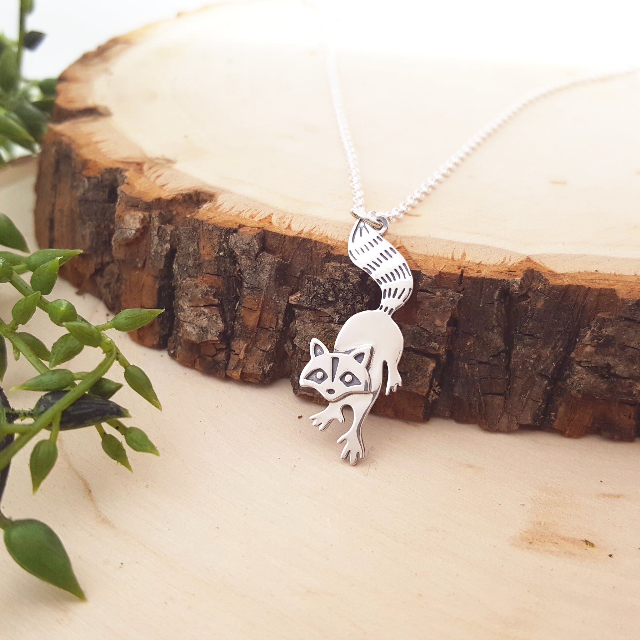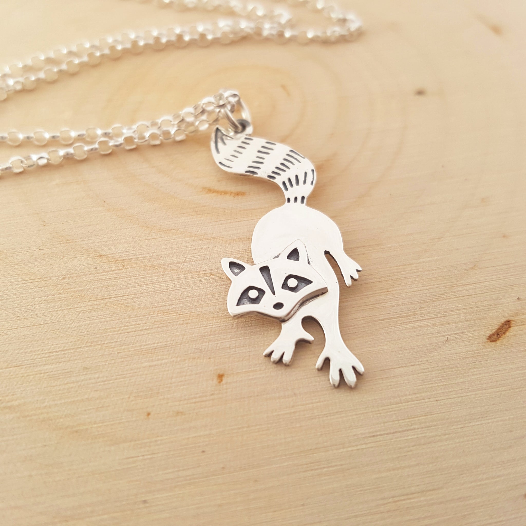 This dainty necklace is handcrafted featuring a detailed Sterling silver adorable Raccoon charm attached to a delicate 18 inch, Sterling Silver cable chain with clasp. Pendant measures 32 x 11mm. Necklace comes on a beautiful insert card, printed on high quality 110lb card stock.