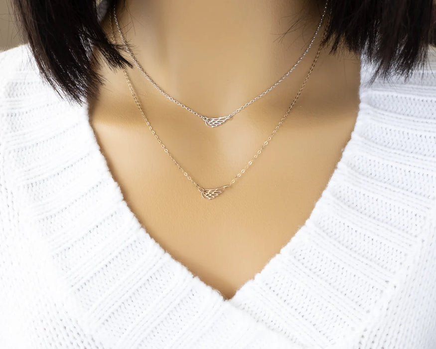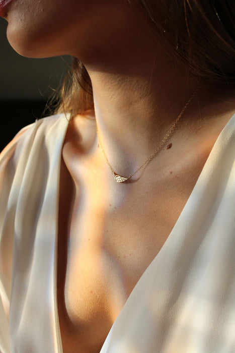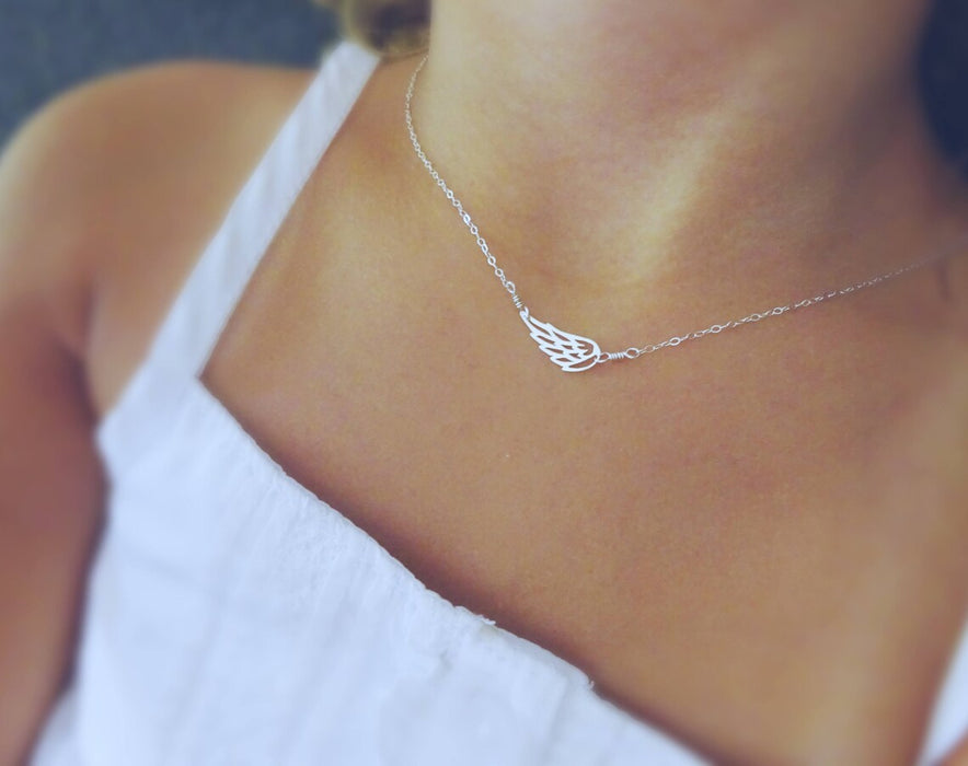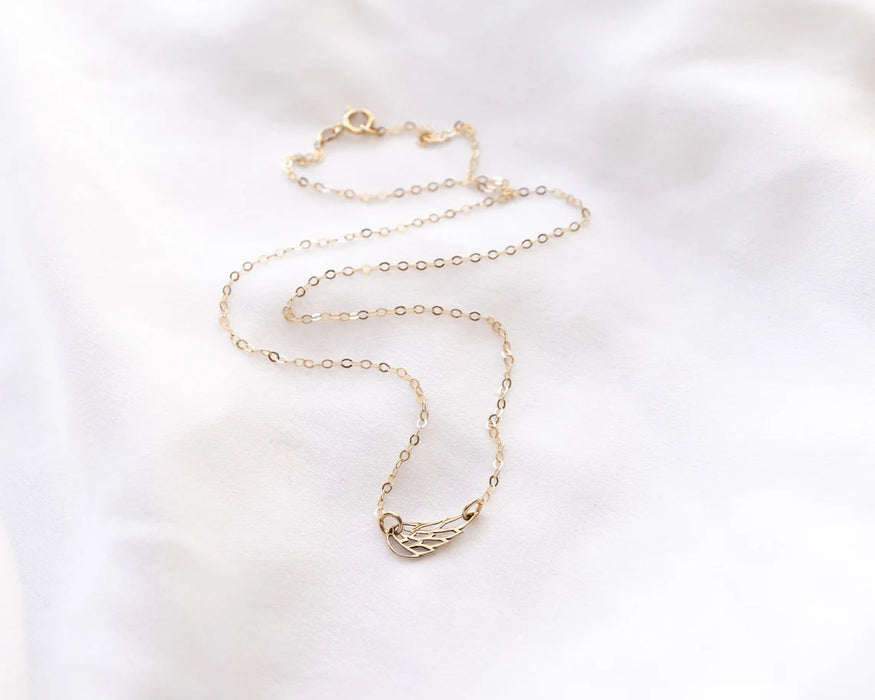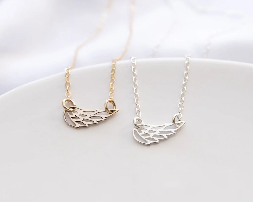 Keep their memory close with this beautifully crafted sideways angel wing necklace. Available in your choice of sterling silver or gold filled, this delicate piece features a graceful wing charm as a symbol of protection, remembrance, and everlasting love.