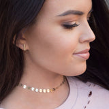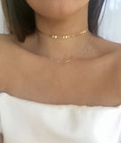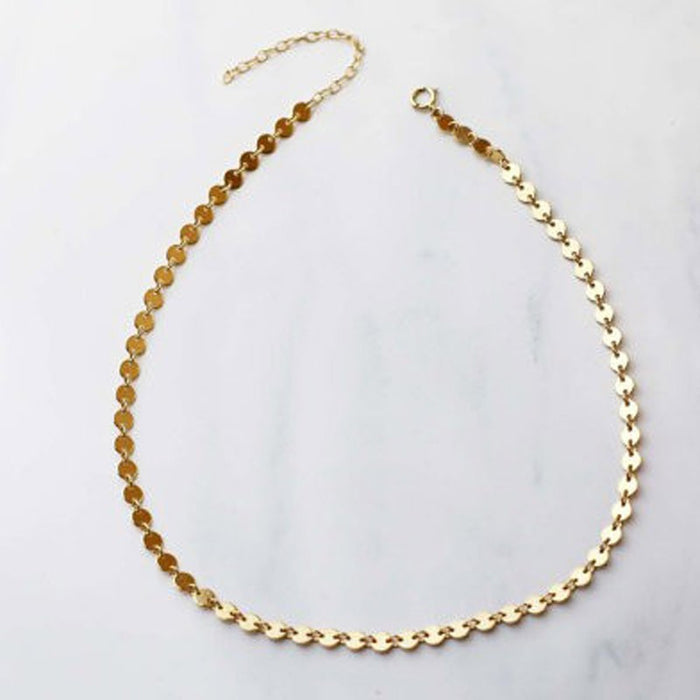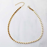 This dainty choker necklace is handcrafted featuring a shimmering gold or silver coin disc chain. Perfect for layering or wearing on it's own. This necklace is adjustable from 12 to 15 inches with a secure lobster clasp closure.