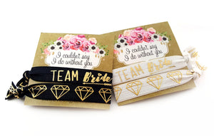 Your special day wouldn't be complete without your Maid of Honor or bridesmaids. These adorable hair tie sets are a perfect way to let them know how much they mean to you. A set of two beautiful soft hair ties in black or white with gold foil "Team Bride" script mark the special occasion.