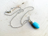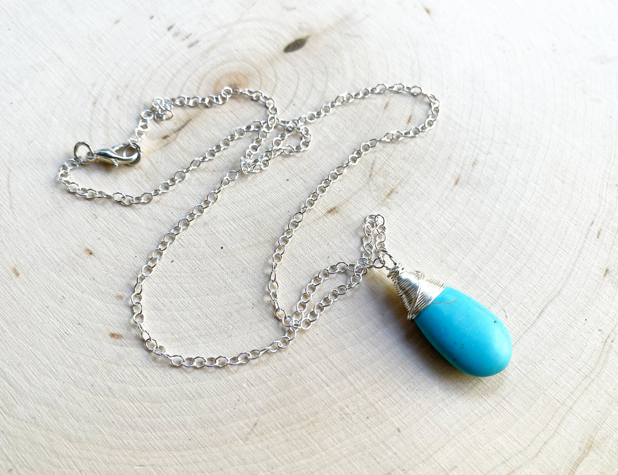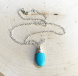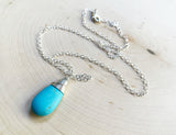 This beautiful Teardrop Turquoise Sterling Silver Necklace is handmade with care and attention to detail. Its unique shape enhances its stylish look and the eye-catching bright blue turquoise gemstone brings an exciting touch of color. Show off your unique style with this striking necklace. This necklace measures 20 inches long. Turquoise pendant is 1.5 inches long.