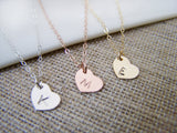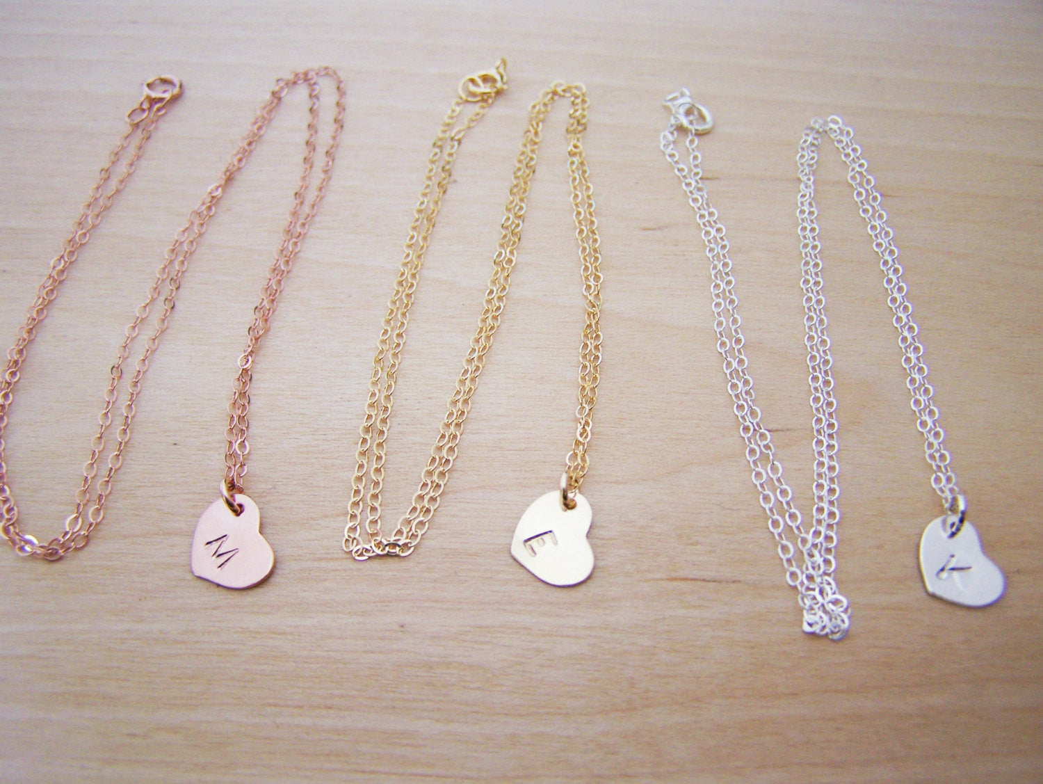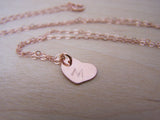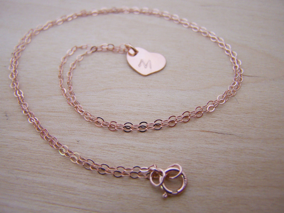 This necklace is handcrafted featuring a minimalist tiny heart charm of the precious metal of your choice (Rose Gold Filled, Yellow Gold Filled, or Sterling Silver), hand stamped with the initial of your choice and attached to a delicate 18 inch gold filled or sterling silver chain.