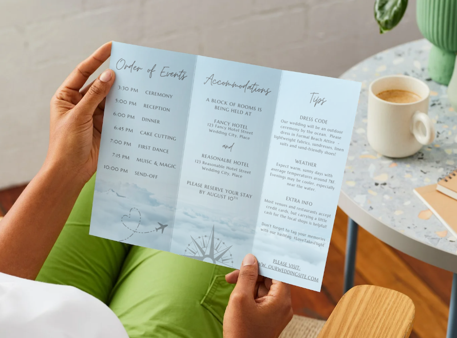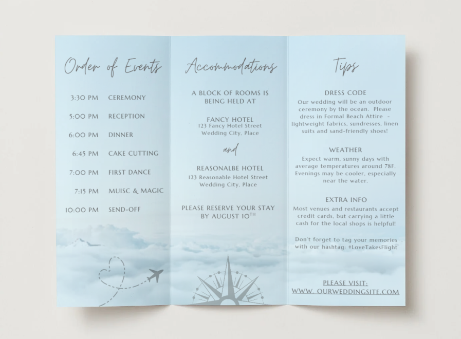Our Love Takes Flight Wedding Itinerary Brochure is the perfect way to keep your guests informed, organized, and excited about your big day!